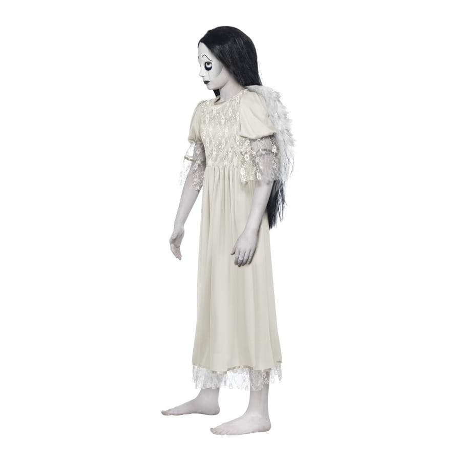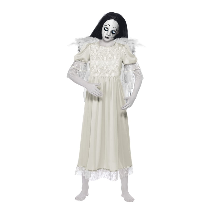 Déguisement de mort-vivante de couleur blanche, pour femme, composé d'une robe, d'ailes et d'un masque. Ce déguisement gothique est disponible en taille XS, S ou M. Il fera de vous un ange déchu mort-vivant à l'occasion d'Halloween.