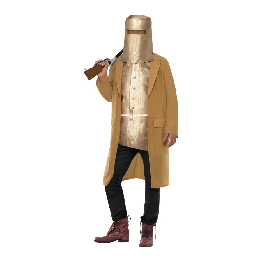 Déguisement de Ned Kelly de couleur beige, pour homme, composé d'une veste avec fausse armure dorée à effet métal et d'un chapeau assorti. Cet ensemble est disponible en taille S, M ou L. Transformez-vous en personnage historique pour votre festival.