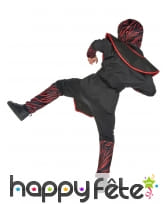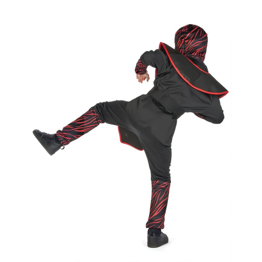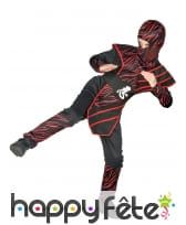 Commencez par le haut et le pantalon, tous deux noirs, rehaussés de bandes tigrées rouges aux extrémités pour ce petit effet "ninja stylé". Pratique, le haut est muni d'un scratch à l'arrière, et pas de panique pour la taille, car le pantalon est élastique. Parfait pour tous les mouvements de karaté endiablés !