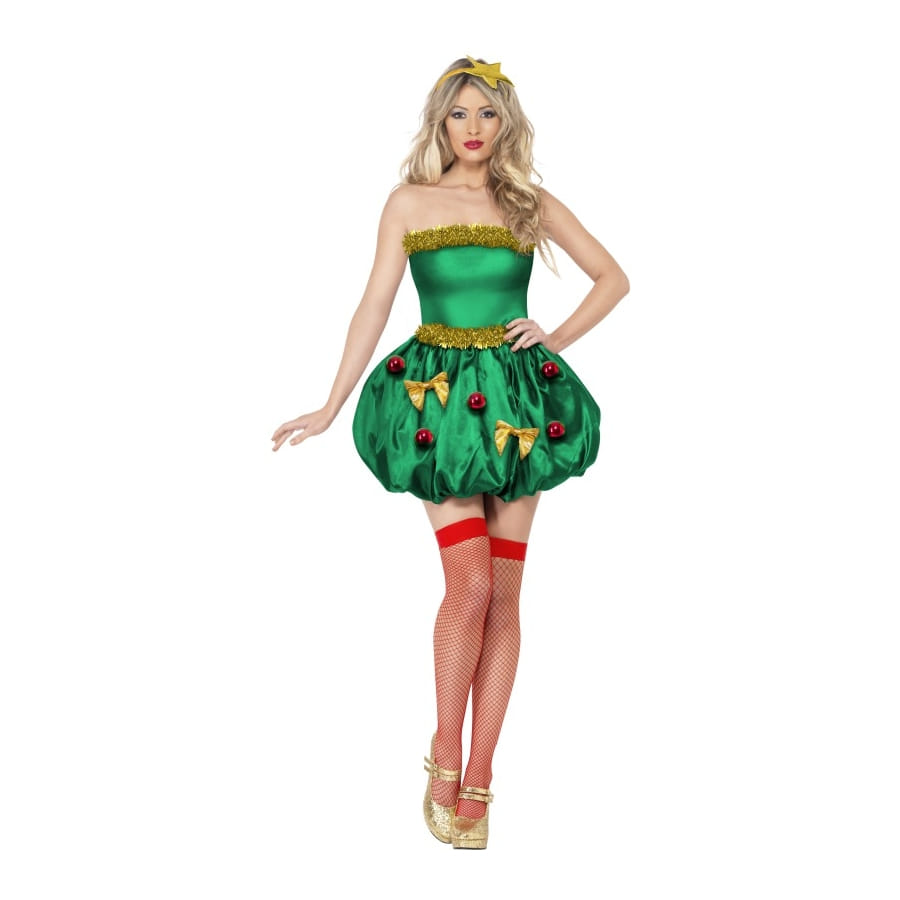 Déguisement d'arbre de Noël sexy, pour femme, composé d'une jolie robe verte et d'un serre-tête monté d'une étoile dorée. La robe est ornée de noeuds dorés et de boules de Noël rouges. Elle est disponible en taille S, M ou L. Elle vous ira à ravir pendant les périodes de fin d'année.