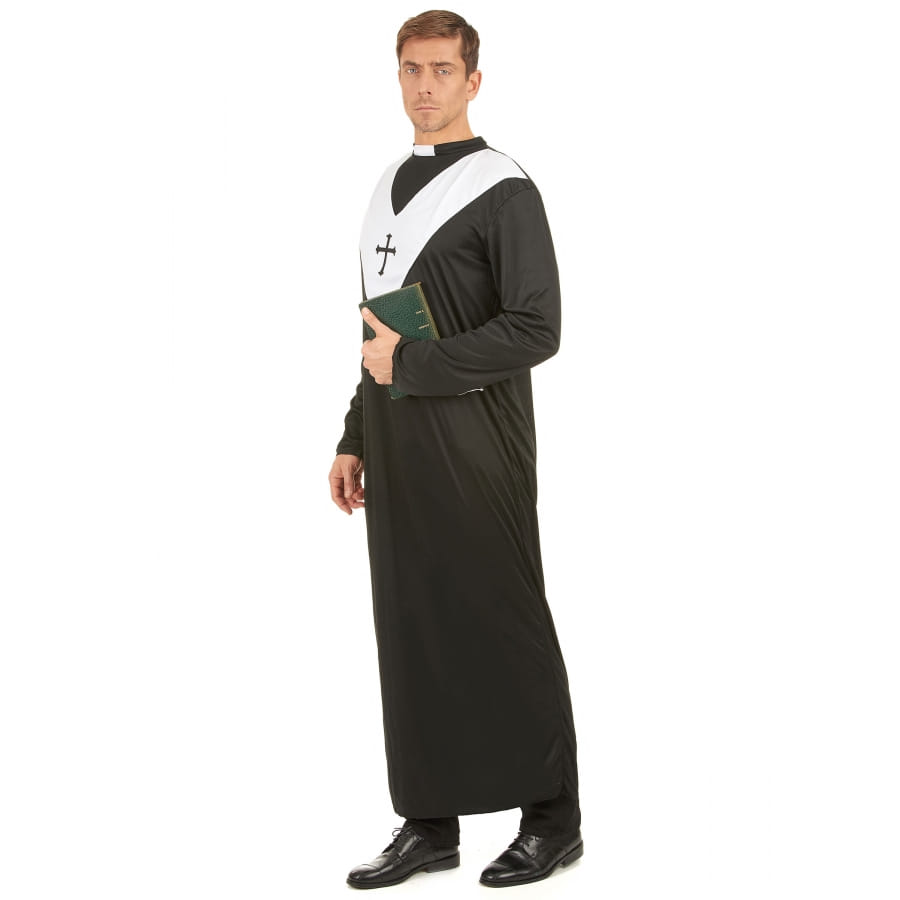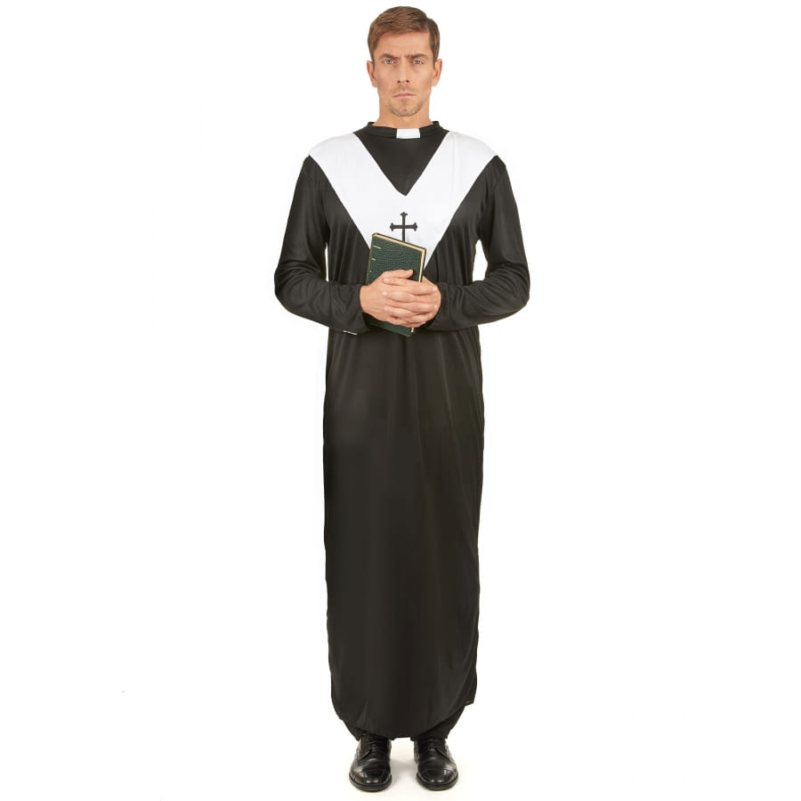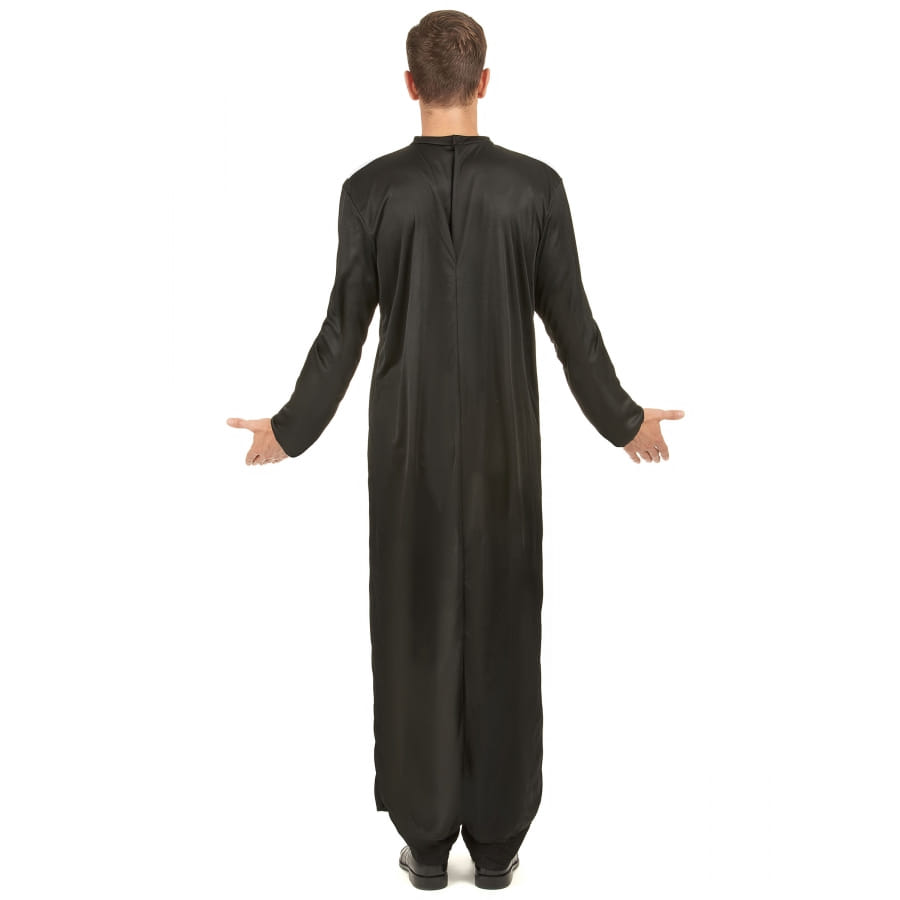 Avant de passer devant le vrai curé à l'église, le futur marié va passer une soirée mémorable en compagnie de ses meilleurs amis. Surprenez-le en enfilant ce déguisement noir et blanc de curé. L'ambiance sera aux fous rires avec un faux religieux qui anime la soirée. Il portera tout simplement une longue robe noire à col blanc. Les manches sont longues et vous distinguerez une petite croix dessinée sur le devant. Le vêtement est ample et agréable à porter, et il donnera un air ultra sérieux à son heureux bénéficiaire. Vous n'aurez plus besoin d'autres artifices pour rendre le costume plus réaliste. Préparez d'ores et déjà vos blagues sur les religieux !