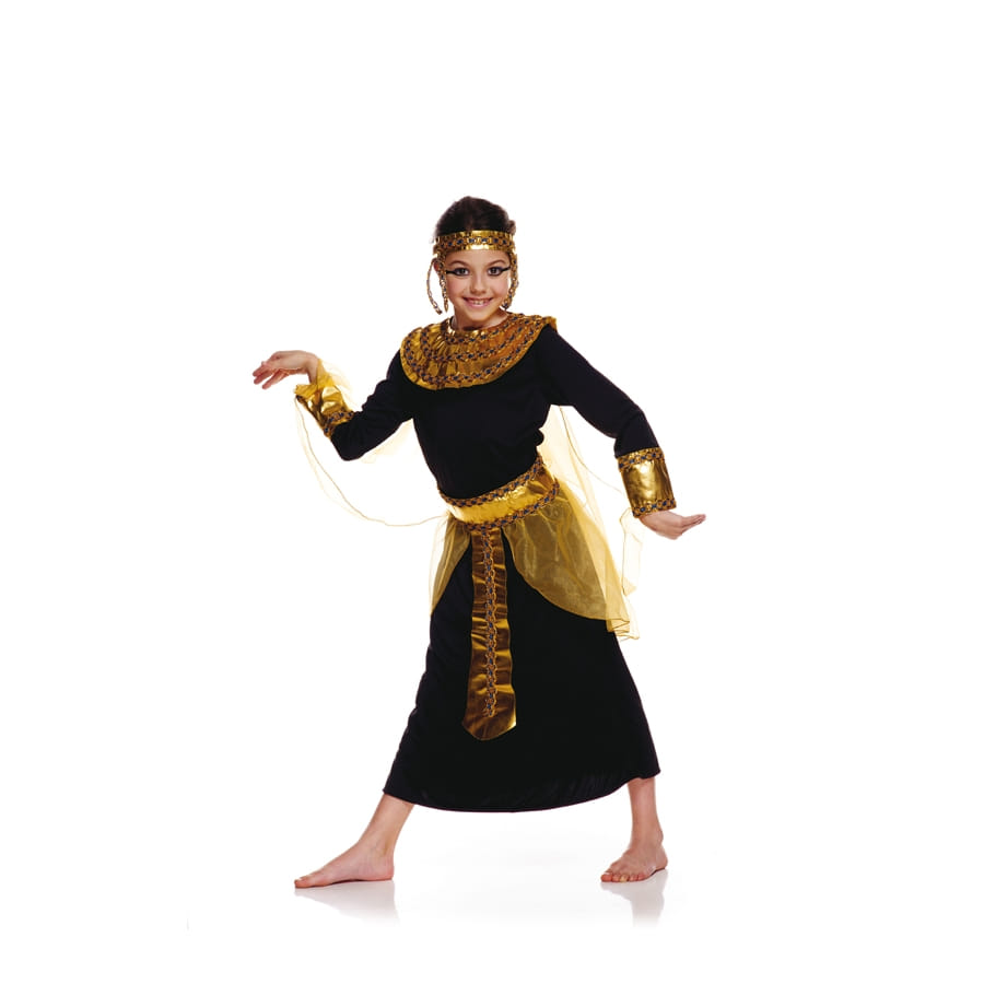 Cléopâtre et Néfertiti ont été deux grandes reines dans l'histoire d'Egypte. Incarner l'une ou l'autre est un privilège que les petites filles peuvent s'accorder seulement sur happyfete ! Faites de la place dans vos armoires mesdemoiselles car le déguisement noir et doré de petite égyptienne débarque en force ! Il comprend une longue robe noire à manches longues, que vous accessoiriserez à l'aide d'une magnifique ceinture dorée et d'un col couleur or et bronze avec voile léger et transparent intégré. Vous disposerez aussi de deux manchettes dorées pour vos poignets, ainsi que d'un bandeau or et bronze orné de fausses pierres bleues. Différentes tailles au choix pour les 5 à 11 ans.