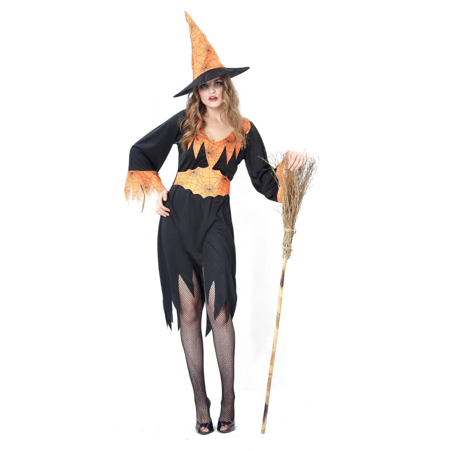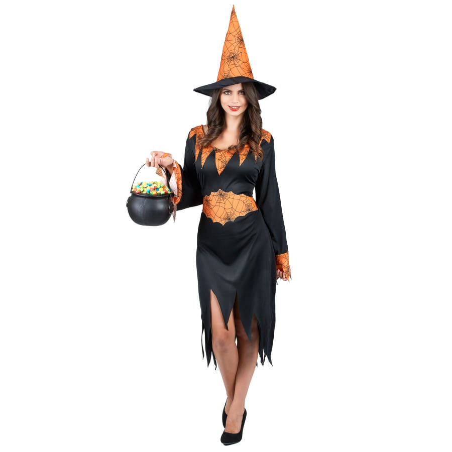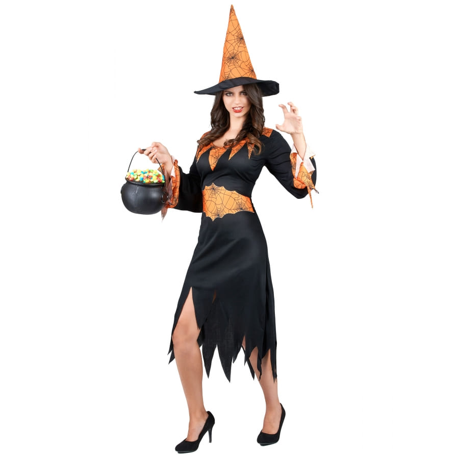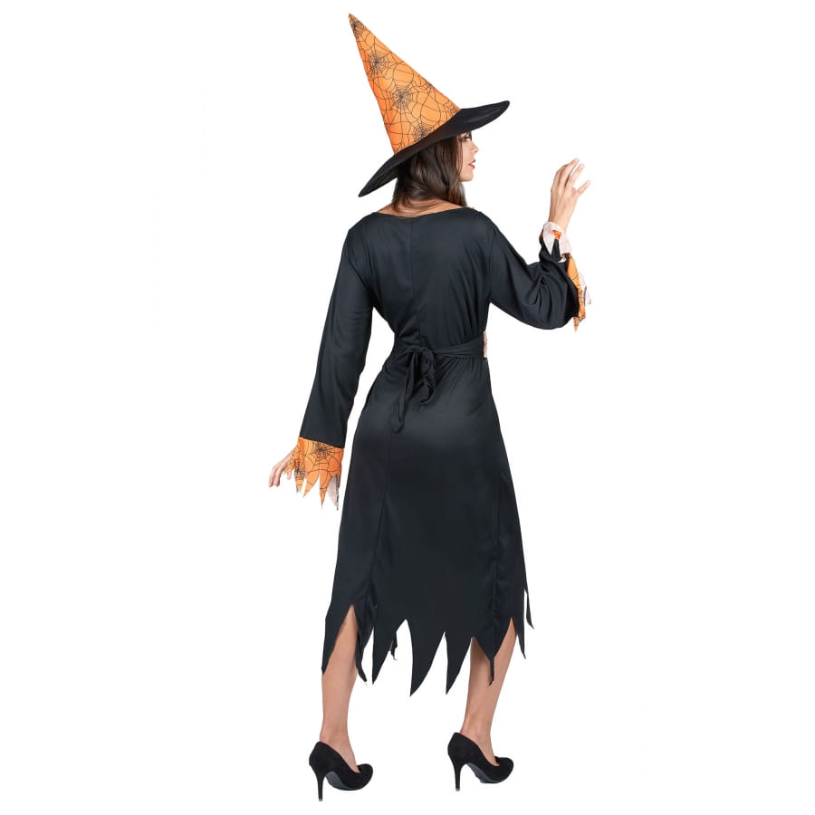 Le déguisement noir et orange de sorcière araignée figure parmi les costumes de sorcières que nous proposons sur notre site. Il se compose d'une robe noire arrivant à hauteur des genoux et à manches longues. Ces dernières sont décorées d'un tissu orange couvert de motifs d'araignée et de leur toile. D'ailleurs, le col de la robe ainsi que la ceinture sont tous composés du même tissu. Il en est de même pour la calotte allongée et pointue du chapeau de sorcière. Quant à sa base, elle reste de couleur noire. Les bords du déguisement noir et orange de sorcière araignée ont été découpés de façon irrégulière afin de donner un effet déchiqueté.