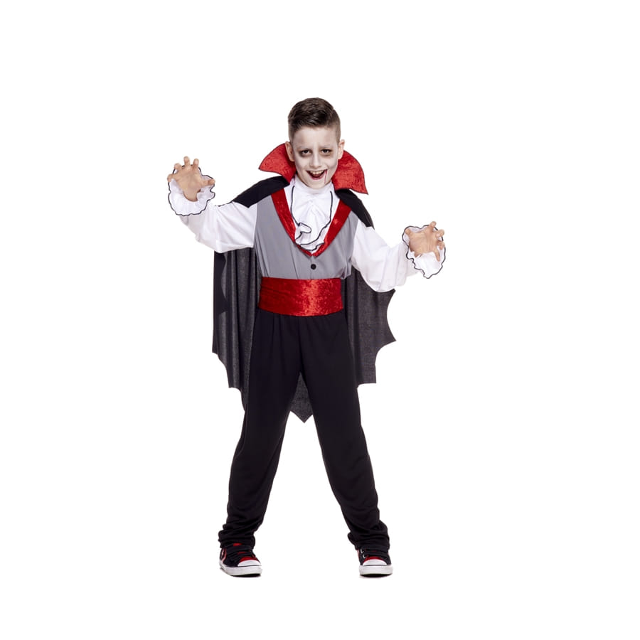 Faites place au prince des vampires ! Avec ce déguisement noir et rouge de vampire pour enfant, votre petit garçon rencontrera un succès fou pour Halloween. Pantalon, gilet, chemise et cape sont les éléments qui constituent le costume. Vous disposerez ainsi d'une tunique pantalon de couleur noire, simple et confortable. Le petit gilet quant à lui est de couleur grise, à porter évidemment en dessus de la chemise. La chemise est blanche, avec de longues manches et un jabot pour donner une allure chic et élégante. Complétez le tout avec la cape noire munie d'un gros col rouge, relevé à l'arrière. Cette tenue stylée s'accorde parfaitement avec un fond de teint clair.