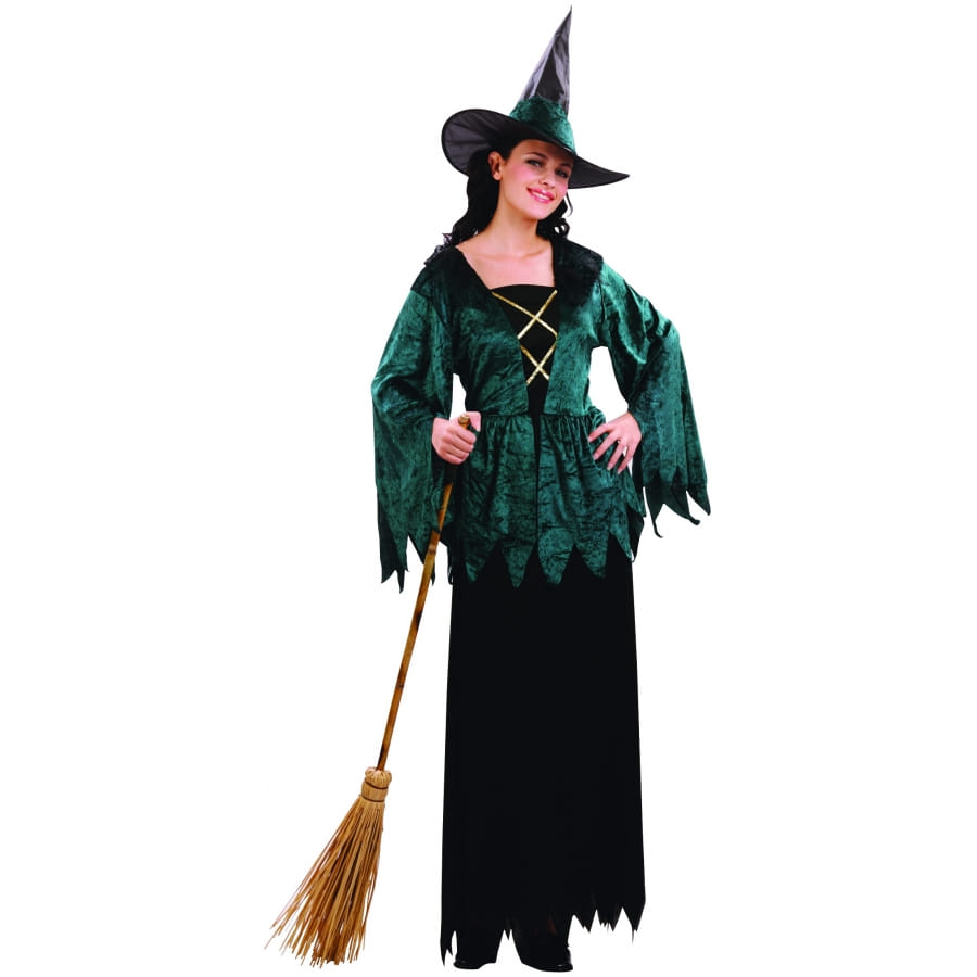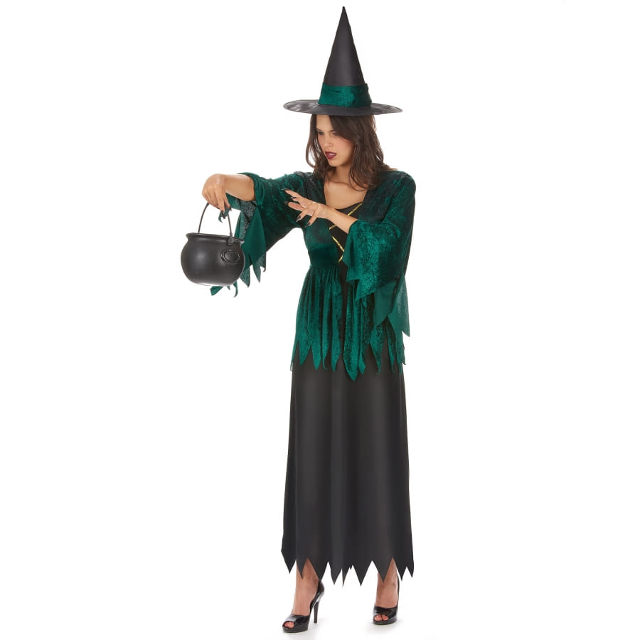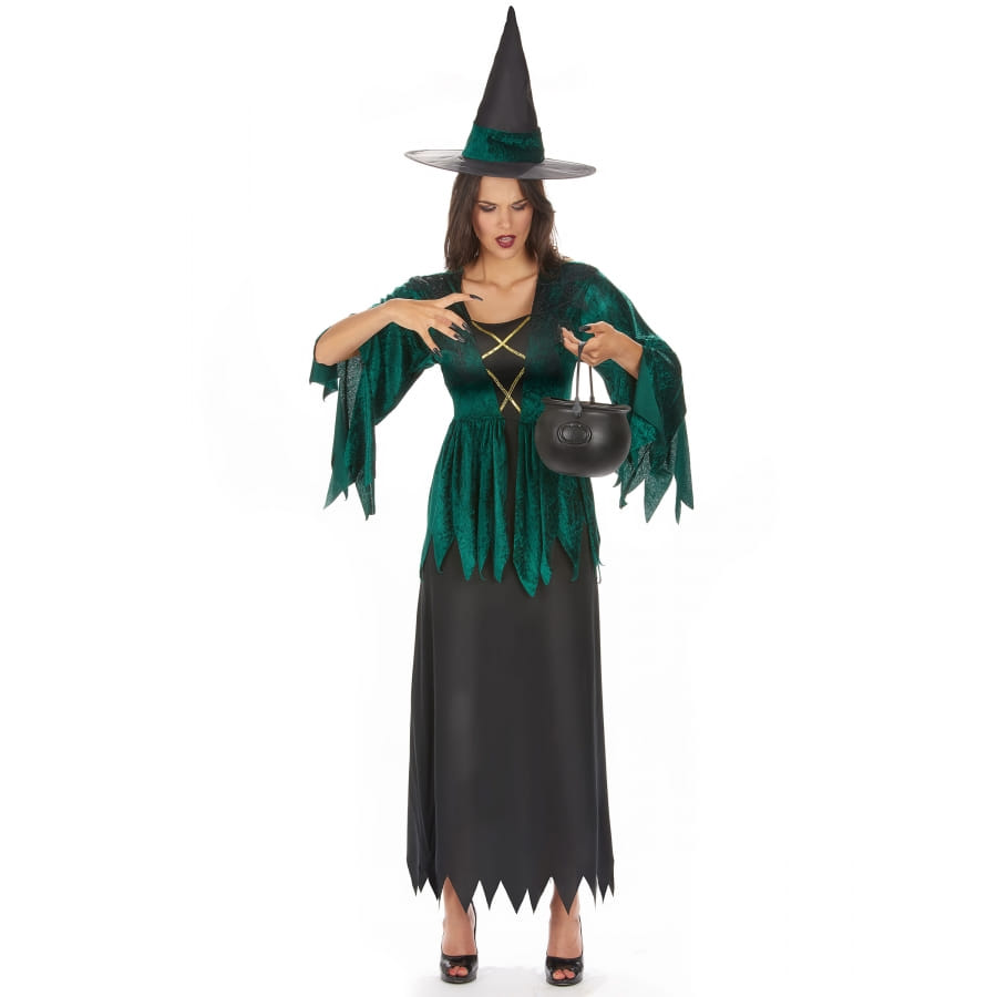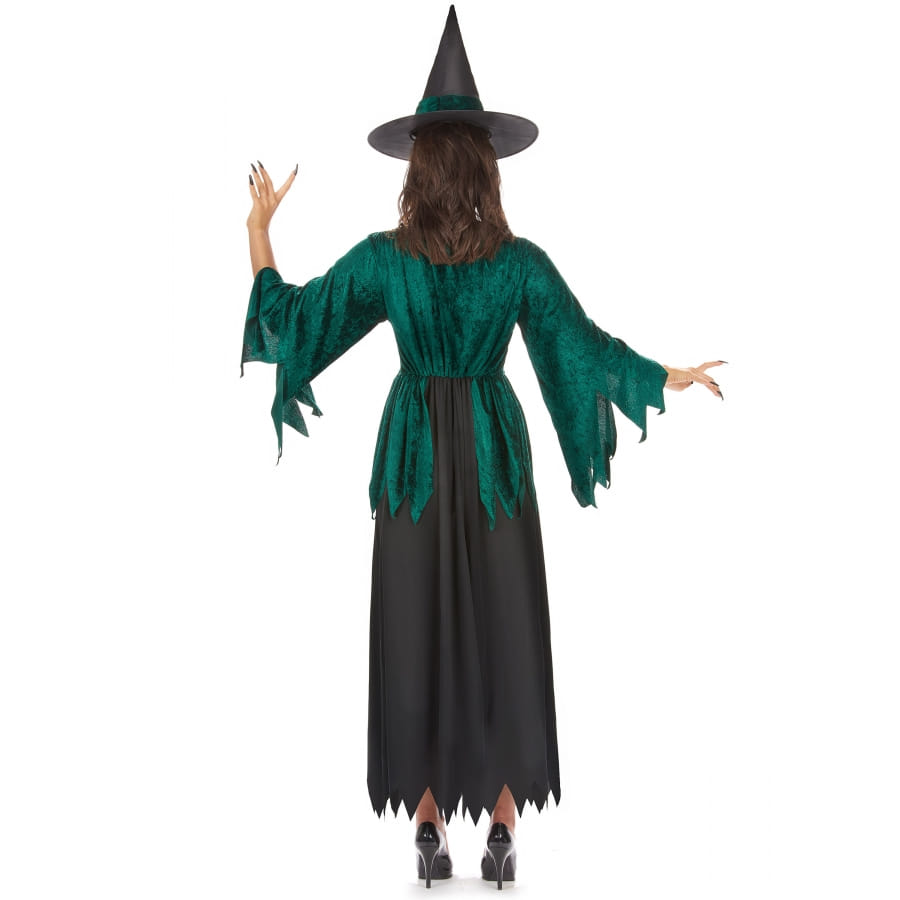Mesdames, si vous voulez vous habiller en sorcière pour la fête des morts, misez sur un costume simple, mais riche en créativité. Pour ce faire, nous vous proposons le déguisement noir et vert de sorcière robe dentelée. Cet article, disponible sur notre site fera de vous une vraie sorcière, digne d'halloween ! Elle se compose d'une longue robe à bordures tailladées en dents de scie, ce qui donne un effet déchiqueté. La matière utilisée pour la fabriquer est un tissu noir dentelé pour la jupe. Le haut se présente sous la forme d'un faux gilet vert à faux laçage doré. La même étoffe se retrouve au niveau de la base du chapeau noir de sorcière qui accompagne cette tenue.