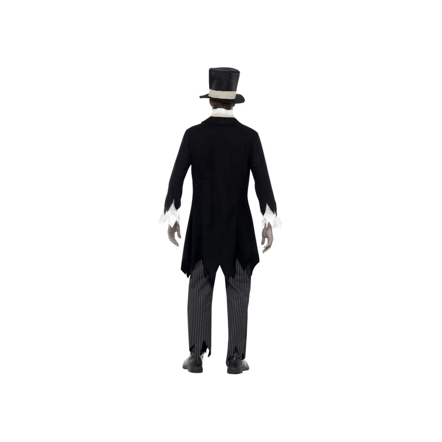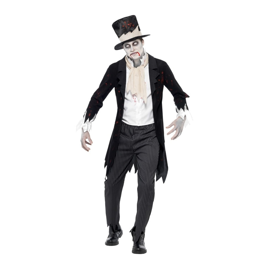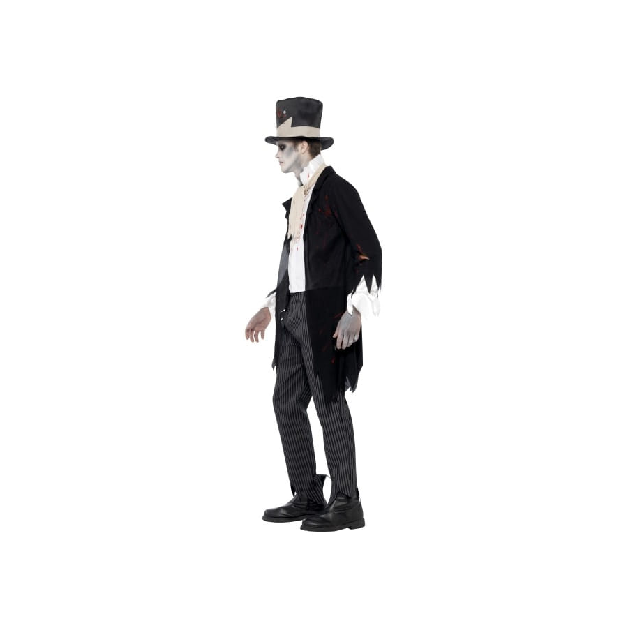Déguisement de groom zombie, pour homme, composé d'une veste noire avec veston blanc, d'un foulard blanc également, d'un pantalon gris et d'un haut-de-forme noir. L'ensemble est tâché de sang pour un effet plus sanglant. Il est disponible en taille S, M ou L. Très original, il fera peur tout en impressionnant vos amis.