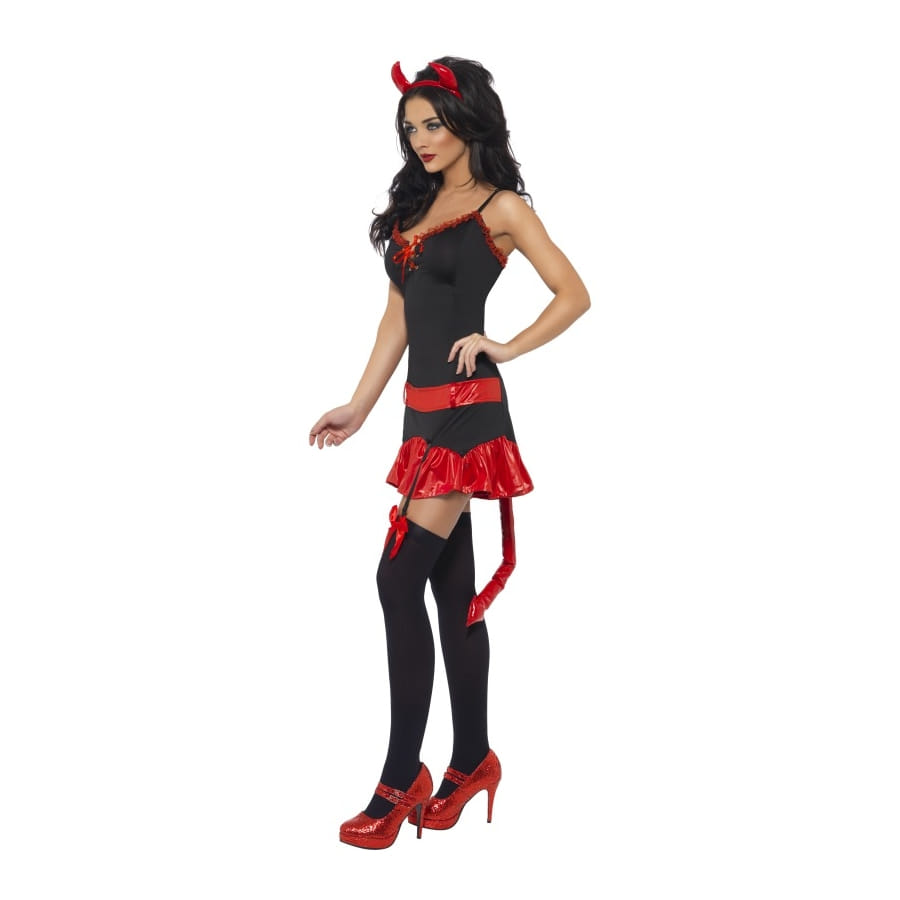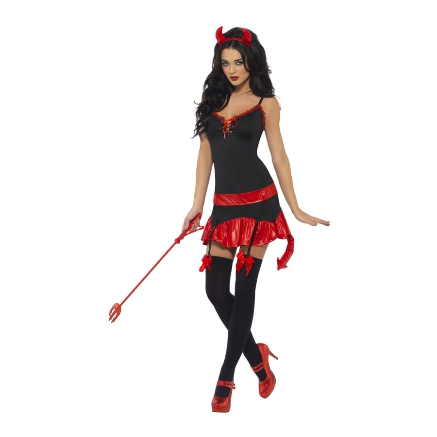 Déguisement de diablesse sexy, pour femme, composé d'un top et d'une jupe rouges et noirs. Cet ensemble moulant vous transformera en diablesse sensuelle pour un enterrement de vie de garçon ou de jeune fille.