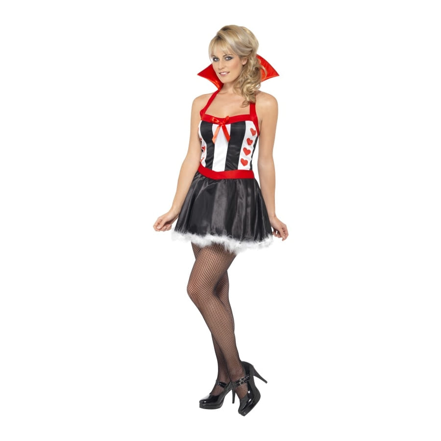 Déguisez-vous en Reine des Coeurs avec cette jolie petite robe. Cette dernière est de couleur rouge et noire, avec un col haut de couleur rouge et des imprimés en coeur. Un jupon est attaché à la jupe, qui est de couleur noire avec un rebord en marabout blanc. Cette robe vous rendra plus sexy que terrifiante.