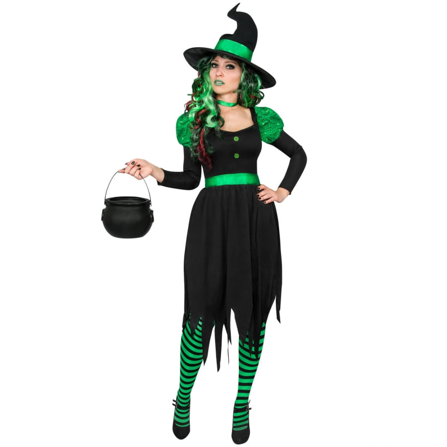Ce déguisement noir vert de sorcière adulte est composé d'une robe et d'un chapeau.