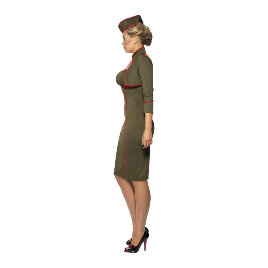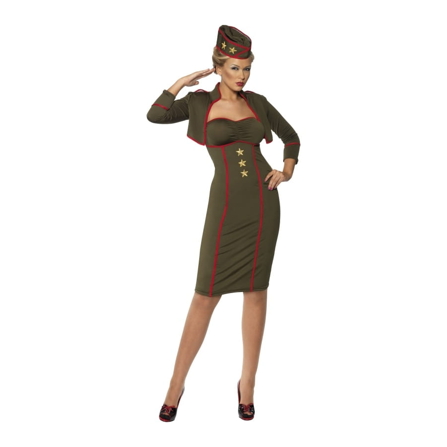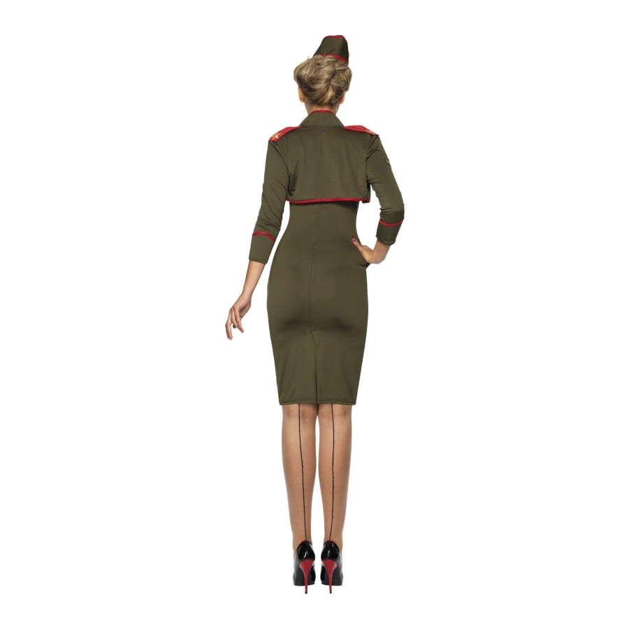 Déguisement de femme officier sexy composé d'une robe verte avec fines raies rouges et étoiles dorées, d'une veste et d'un chapeau assortis. Cet ensemble peut être commandé en taille S, M ou L. Cette robe moulante mais mi-longue vous donnera un air d'officière sexy et sévère.