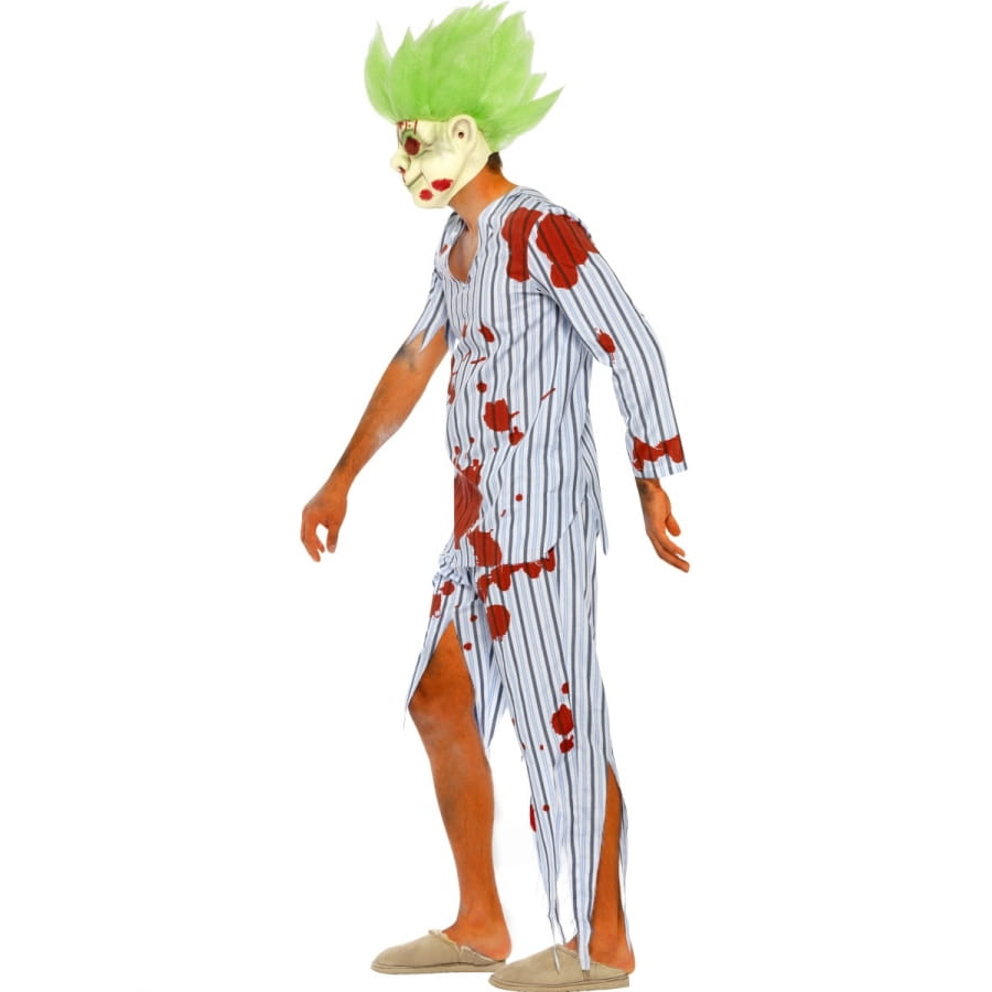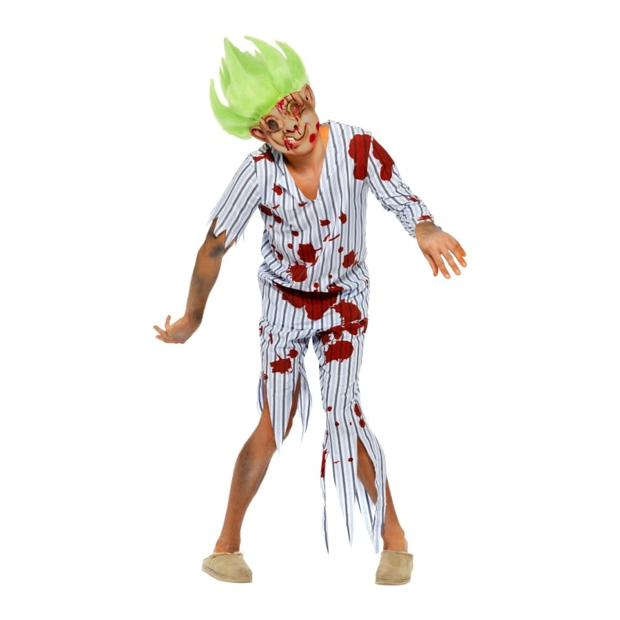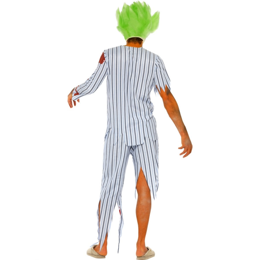Déguisement d'ogre zombie, pour adulte, composé d'un top et pantalon à rayues bleues et blanches, d'un masque effrayant et d'une perruque vert fluo. Le tout est tâché de sang et déchiré, disponible en taille S, M ou L. Ce sera votre vous le plus effrayant de sa soirée d'Halloween.