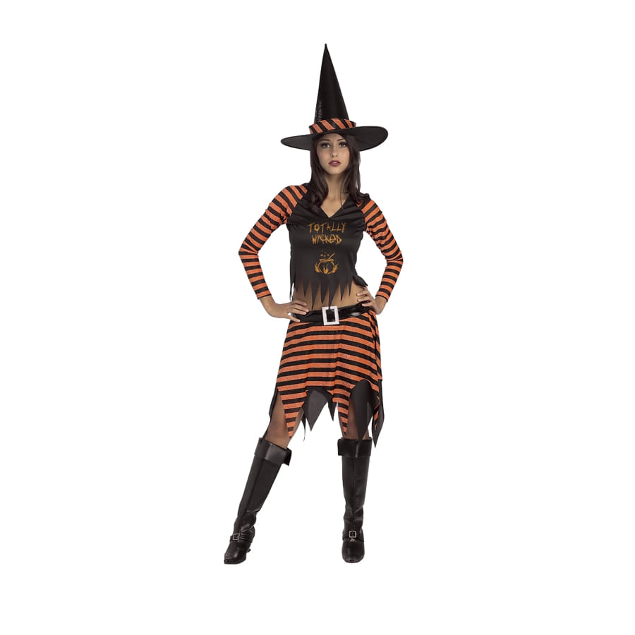 Faites de votre petite fille la plus belle, la plus charmante et aussi la plus méchante de toutes les sorcières ! Nous vous proposons ce splendide costume de sorcière rayé de deux belles couleurs qui se marient très bien : orange et noir, composé d'une chemise à manches longues et d'une jupe. Ces vêtements sont dentelés et dotés d'une grande qualité. L'ensemble est accompagné d'un chapeau pointu noir avec une bande assortie aux vêtements, cousue sur le bas du cône. Ce costume spécialement créé pour les petites filles et les adolescentes sera idéal pour Halloween, ou une soirée entre copines sur le thème de la magie et de la sorcellerie. Une belle paire de bottes noires accompagnera à merveille ce déguisement.