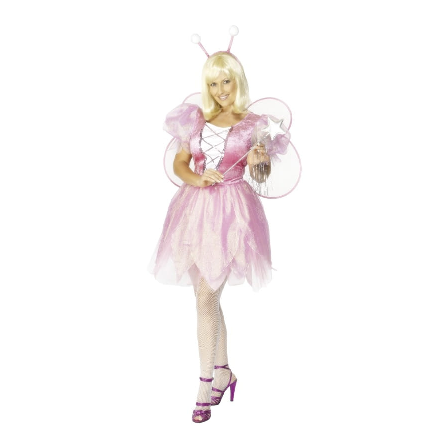 Déguisement de papillon sexy, pour femme, composé d'une robe rose et blanche avec dessous en filet, d'une paire d'ailes transparentes et d'un serre-tête monté de deux antennes. Cette tenue est idéale pour une fête basée sur le thème des princesses ou des fées.