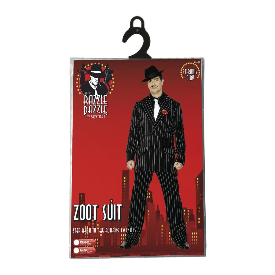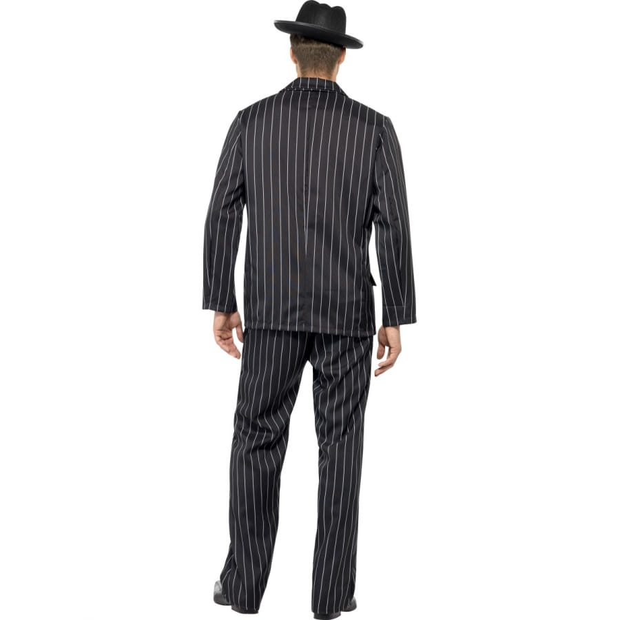 Déguisement de parrain de couleur noire à rayures blanches, pour homme, composé d'une veste, d'un pantalon, d'une fausse chemise et d'une cravate. Le tout est disponible en taille S, M ou L. Amusez-vous à jouer au gangster notoire à l'occasion d'une fête basée sur le thème de la mafia.