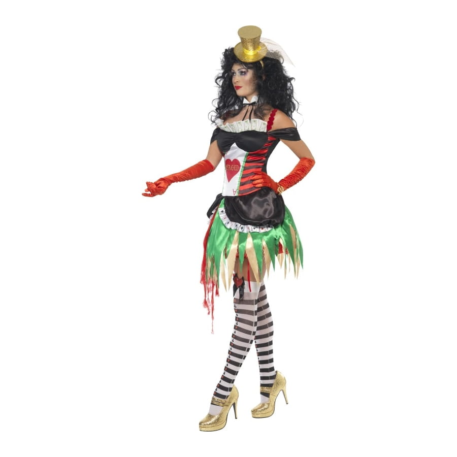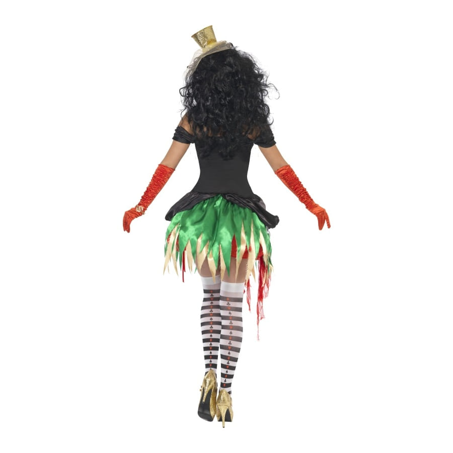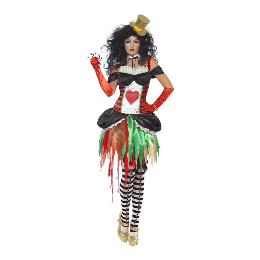 Déguisement inspiré du péché capital de l'avidité, pour femme. Le set comprend une robe et un col. La robe est en forme de corset noir et blanc avec des rayures rouges et noires avec un jupon noir à franges rouges et vertes. Le col est blanc avec un noeud noir. Le tout est disponible en taille S, M ou L. Ce déguisement est très approprié pour une fête d'Halloween ou pour une soirée à thème.