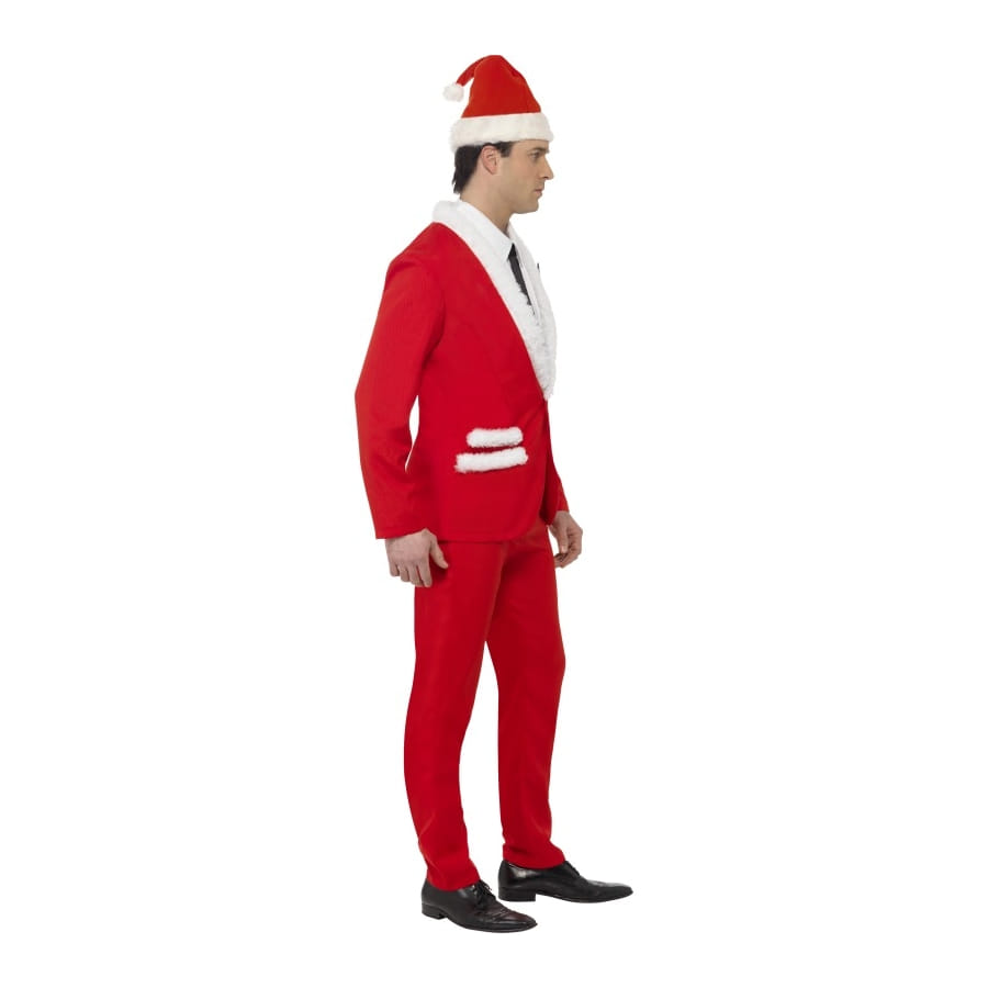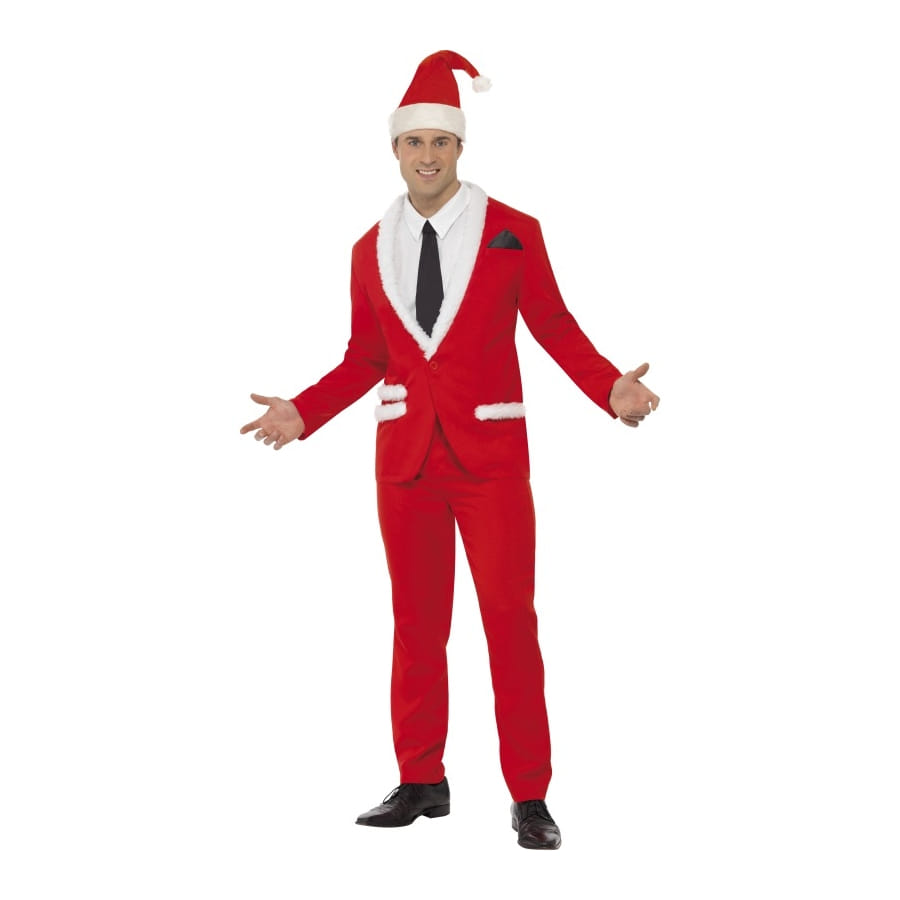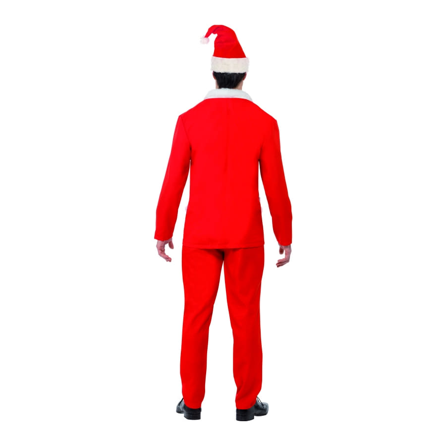 Déguisement de Père Noël de couleur rouge, pour homme, composé d'un pantalon, d'une veste avec poches en marabout blanc et d'un bonnet avec bord et pompom blancs. La veste est intégrée d'une chemise blanche et d'une cravate noire. Cet ensemble est disponible en taille S, M ou L. Déguisez-vous en Père Noël élégant et moderne!
