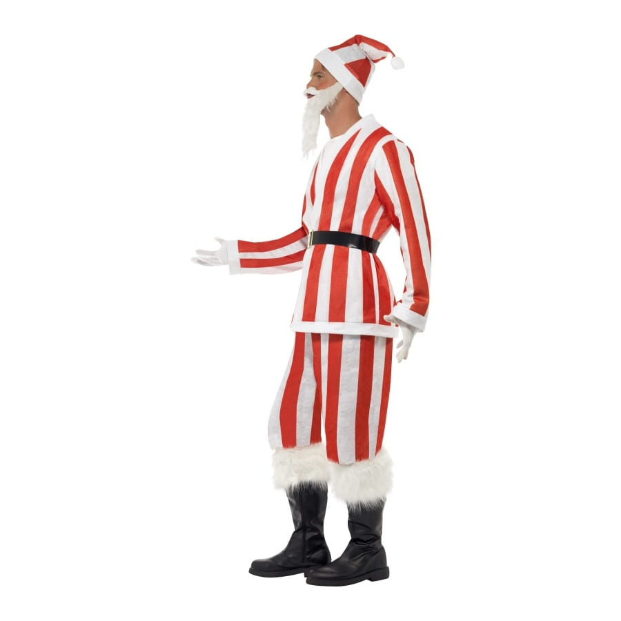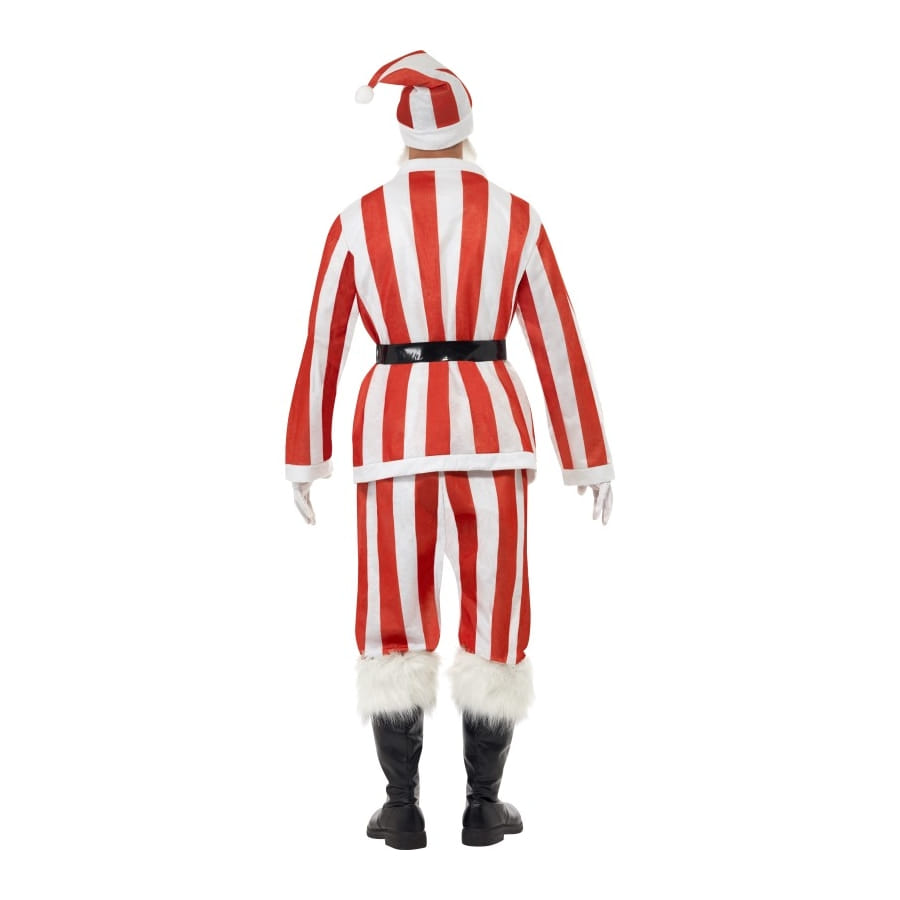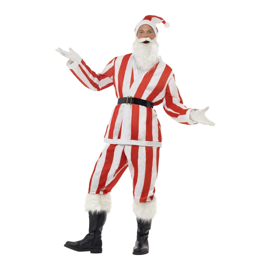 Ce déguisement de Père Noël très singulier vous donnera un look particulièrement original à l'occasion de Noël ou d'un évènement sportif. Il est composé d'une veste, d'un pantalon, d'un chapeau, d'une barbe et d'une ceinture. A part la ceinture qui est noire et la barbe qui est blanche, tout l'ensemble est à rayures rouges et blanches. Il est disponible en taille L, qui correspond à un tour de poitrine de 106-110 centimètres et à une entrejambe de 83,8 centimètres.