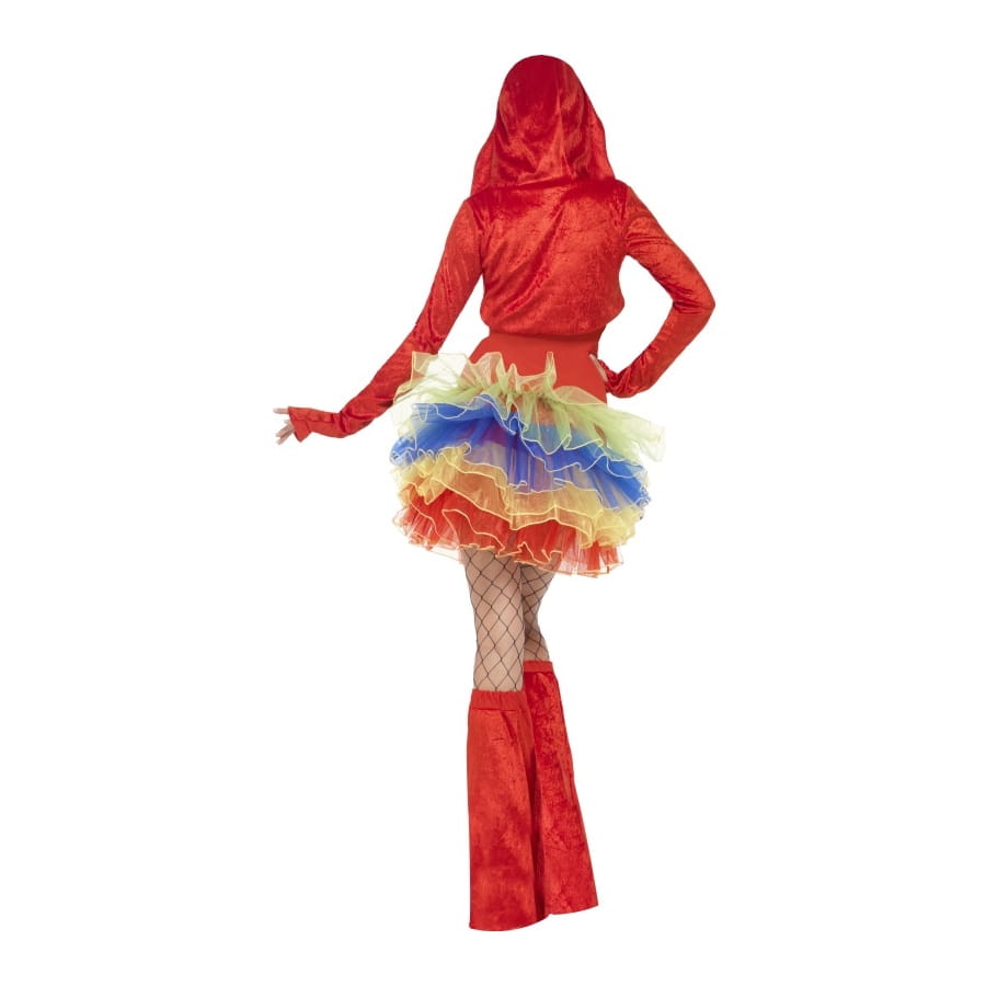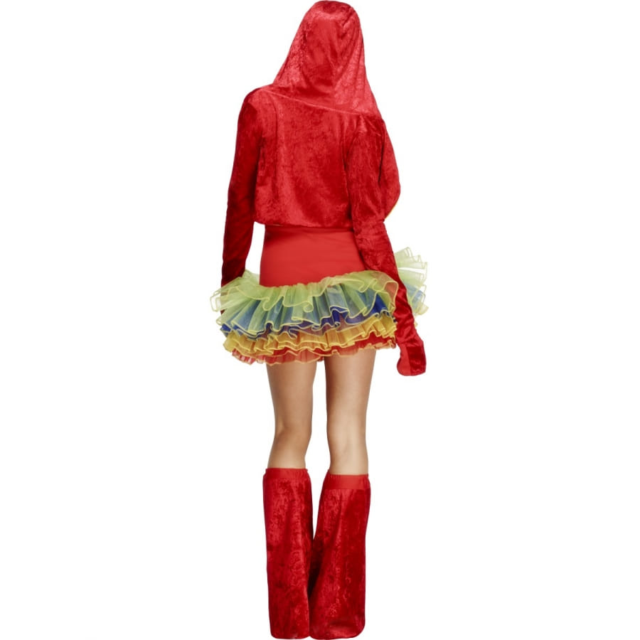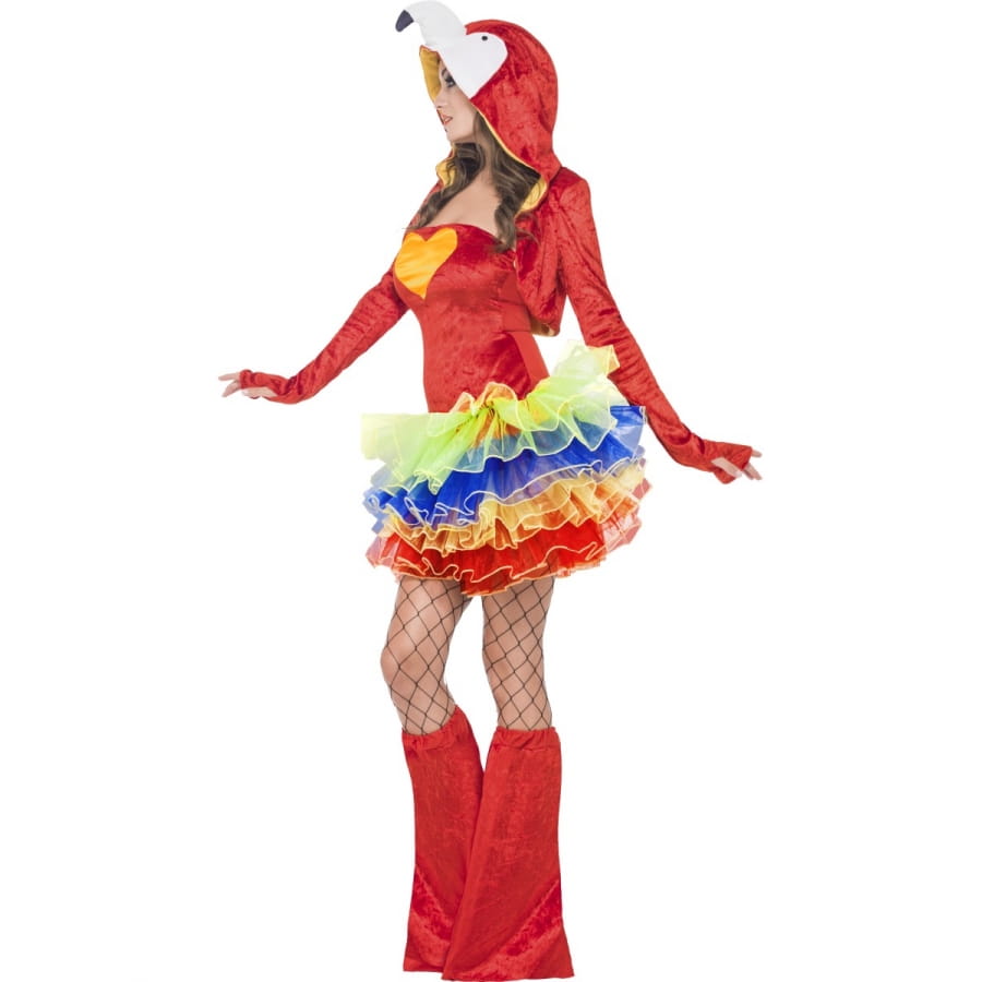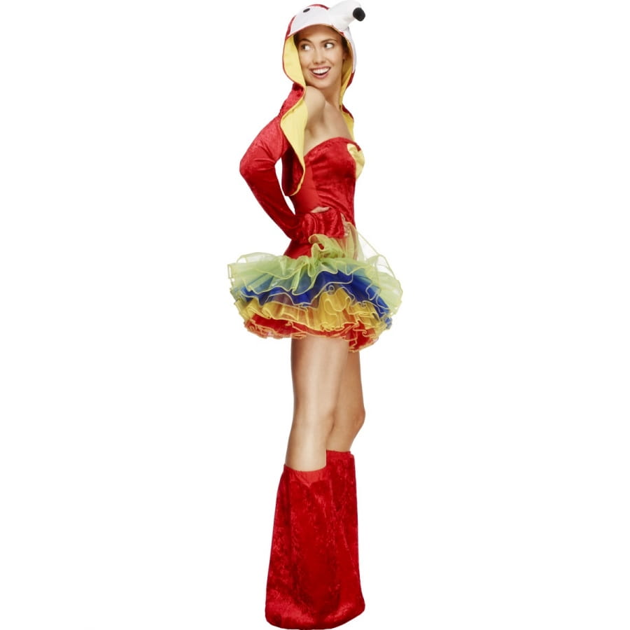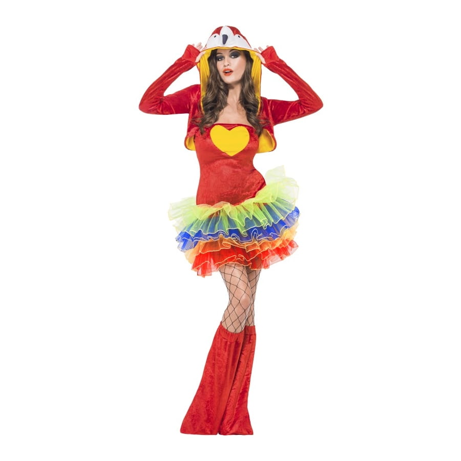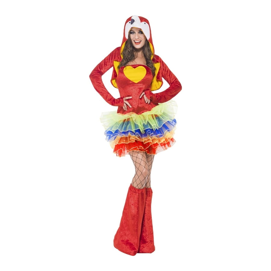 Les perroquets sont de jolis oiseaux très intelligents et avec des plumes très colorées. Si comme nous, vous aimez les belles couleurs vives du perroquet, ce déguisement perroquet tutu coloré est fait pour vous. Il est constitué d'une robe rouge très mignonne, à bretelles amovibles, avec un dessin de coeur jaune au niveau de la poitrine, et un beau tutu de couleur jaune, bleu, orange et rouge. La robe va avec une veste style boléro à capuche rouge à l'extérieur et jaune à l'intérieur, la capuche est ornée du visage tout blanc du perroquet avec ses yeux et son bec. Les tailles disponibles sont : XS (32-34), S a(36-38), M (40-42) et L (44-46).