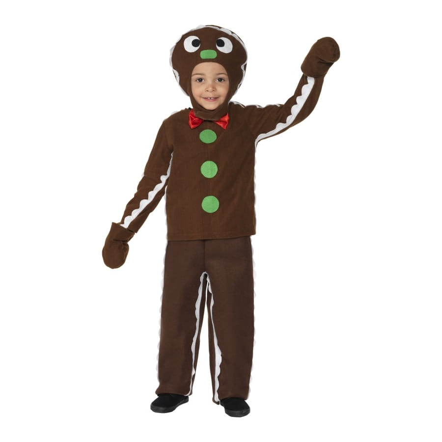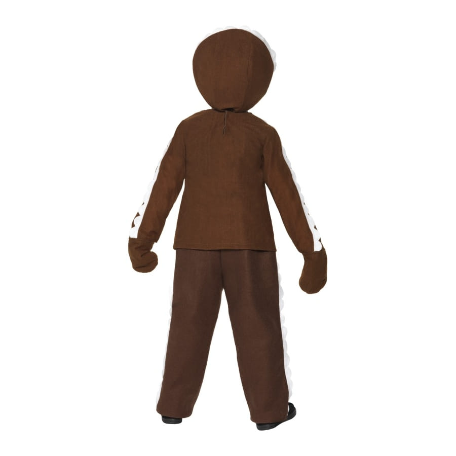 Déguisement de petit homme gingembre de couleur marron, pour enfant, composé d'un top, d'un pantalon et d'un chapeau en forme de tête. Ce déguisement est disponible en taille S, M ou T2. Il est agrémenté de boutons verts et d'un noeud papillon rouge. Votre enfant aura un déguisement originale pour sa fête.