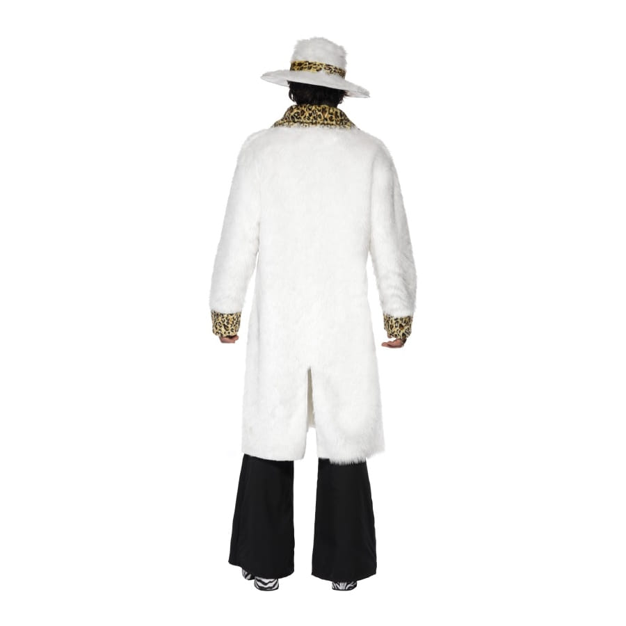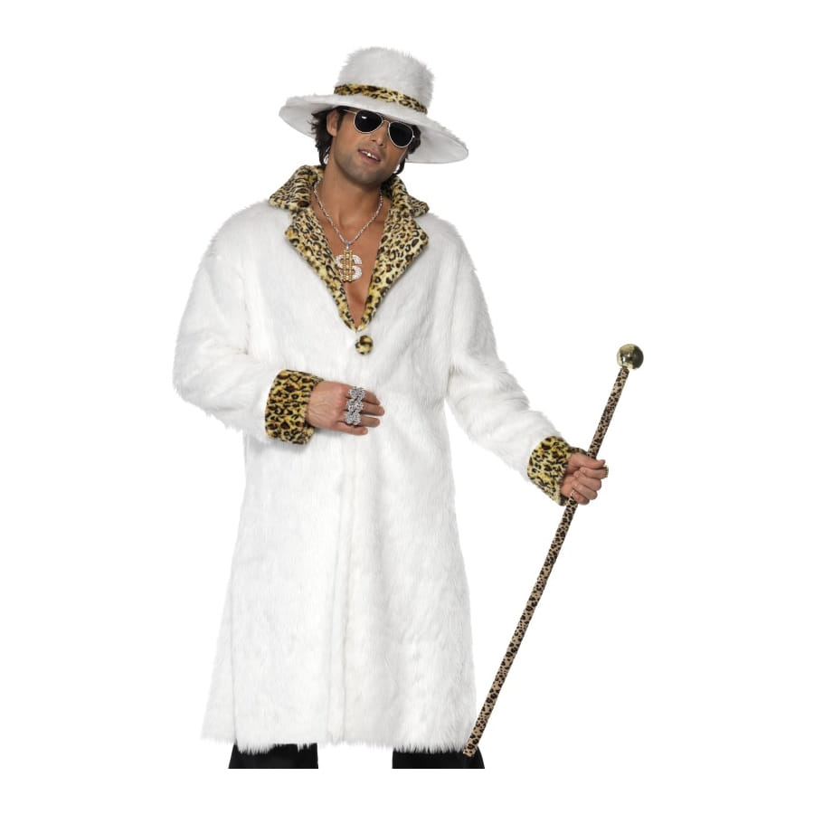 Déguisement de pimp, pour homme, composé d'un manteau en fausse fourrure de couleur blanche avec col et manches léopard ainsi que d'un chapeau et d'un pantalon assortis. Ajoutez-y des lunettes de soleil pour compléter le look bling bling.