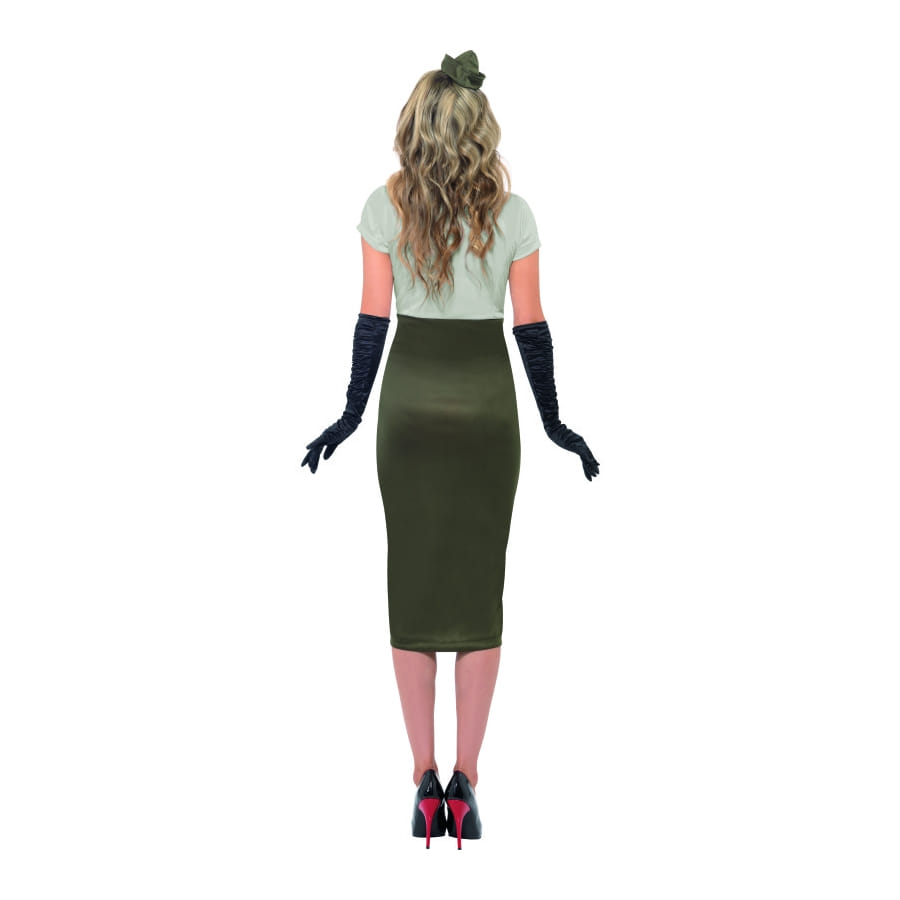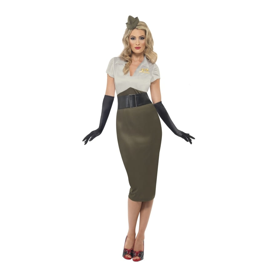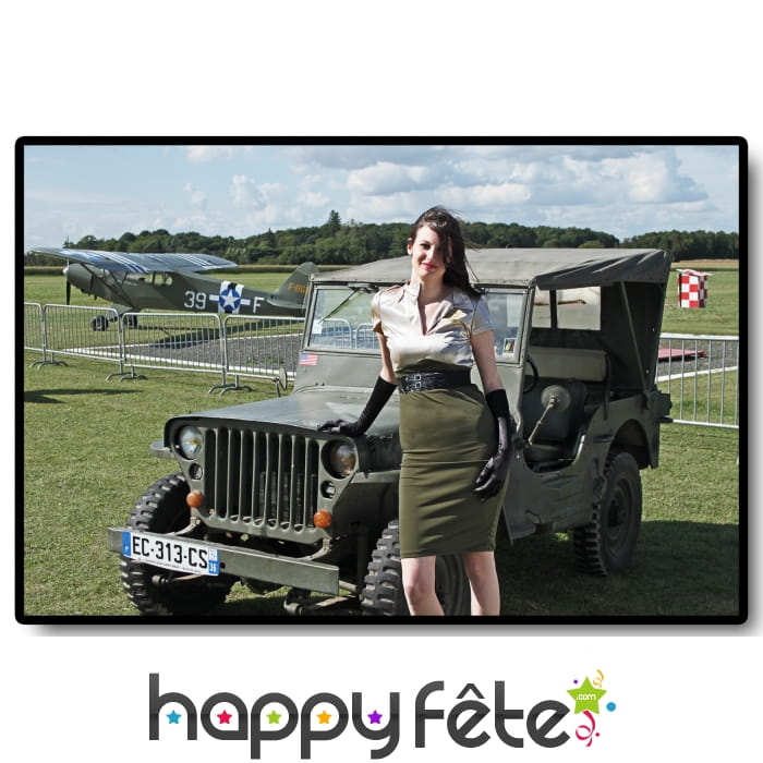 Déguisement de Pin-Up de l'armée, pour femme, composé d'une robe blanche et kaki et d'un chapeau assorti. La robe est également ornée d'une grosse ceinture noire. Elle est disponible en taille S, M, L ou X1. Avec ce style, mi-militaire et mi-pin-up, vous serez sûre de faire tourner la tête à ces messieurs!