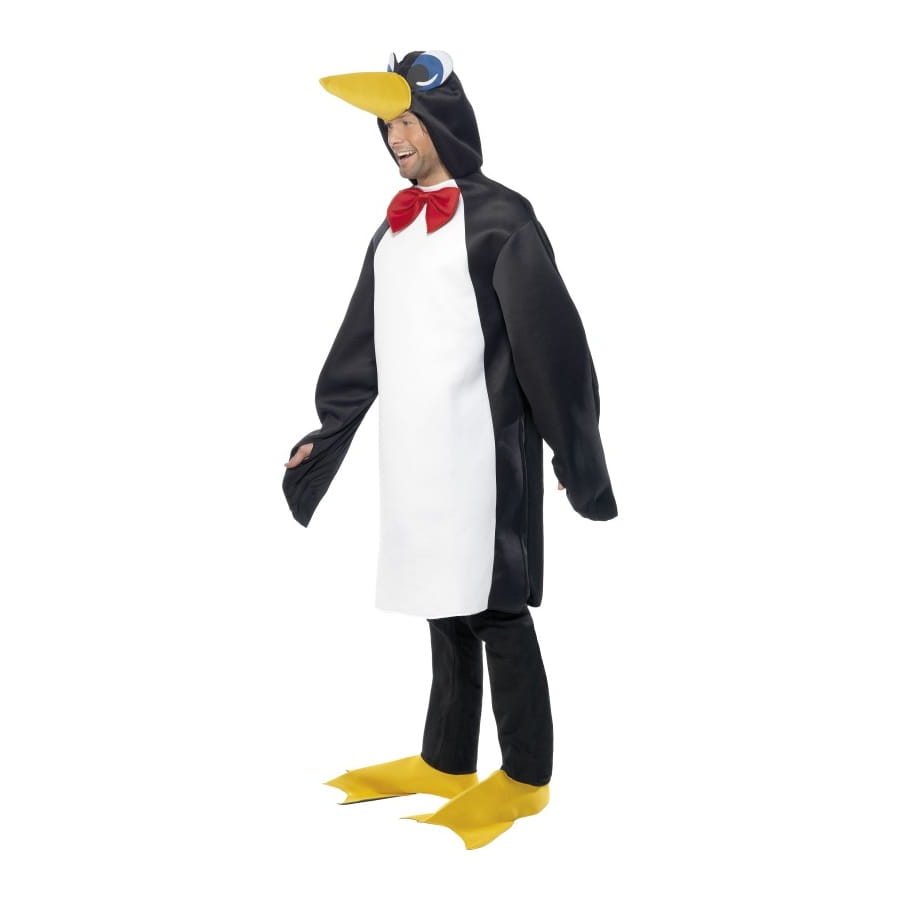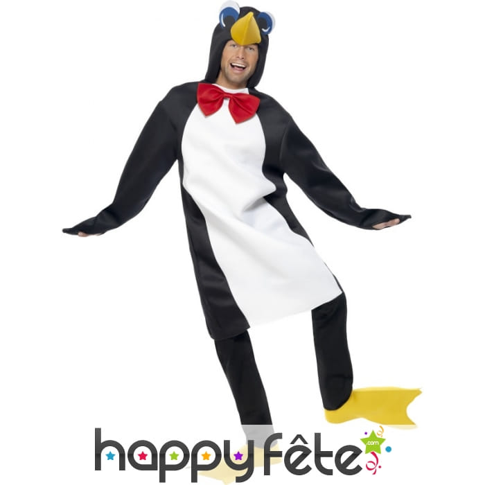 Costume de pingouin de couleur noire et blanche, pour homme, femme, adolescent ou adolescente. La combinaison est ornée d'un noeud papillon rouge. Ce déguisement est parfait pour un carnaval ou une fête basée sur le thème des animaux.