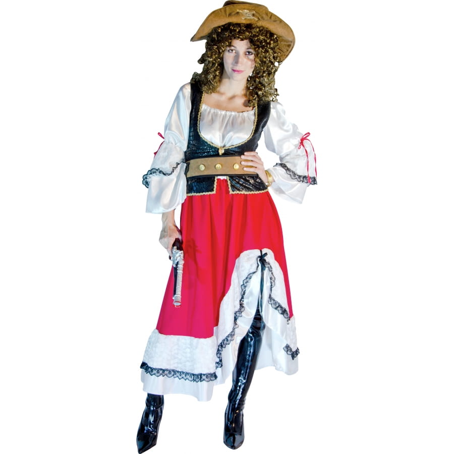 Déguisement de pirate, pour femme, composé d'une jupe, d'une chemise, d'un gilet, d'une ceinture et d'une coiffe. La jupe est de couleur rouge et blanche avec de la dentelle noire, la chemise est blanche avec dentelle noire, le gilet est noir avec bordure dorée, la ceinture est de couleur marron, assortie à la coiffe. Le tout est disponible en taille 38-40 ou 42-44. Idéal pour une soirée pirate.