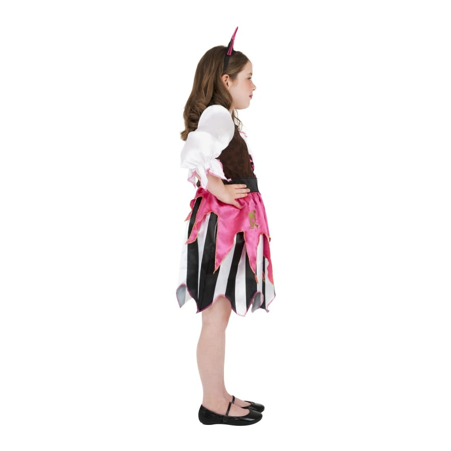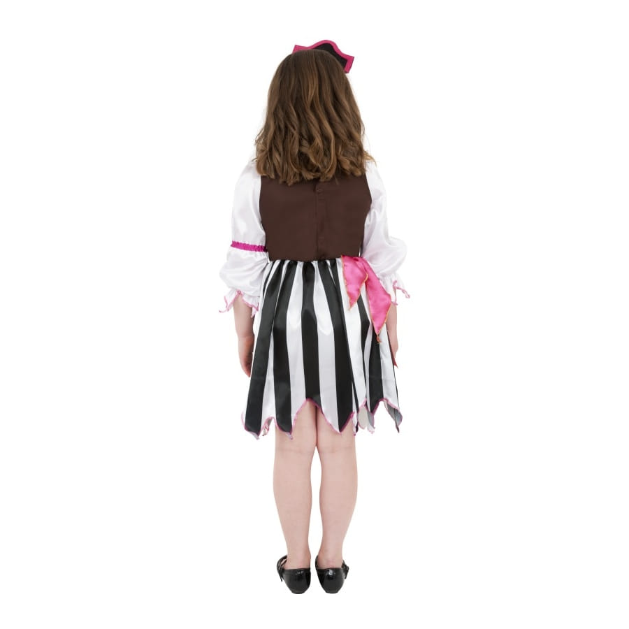 Déguisement de pirate, pour fille, composé d'une petite robe rose, blanche et noire et d'un bandeau. Ce dernier est monté d'un mini chapeau de pirate de couleur rose et noire avec un symbole de pirate doré. La robe est disponible en taille S, M ou L. Elle fera de votre fille une vraie pirate aventurière.