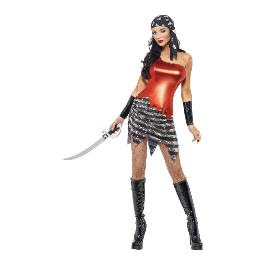 Avec ce déguisement vous serez la plus sexy des pirate. Tout le monde aura les yeux rivé sur vous. Ce déguisement est composé d'un bandana de couleur noir avec des tête de mort, d'un top rouge , de bracelets noir et d'une jupe noir et gris.