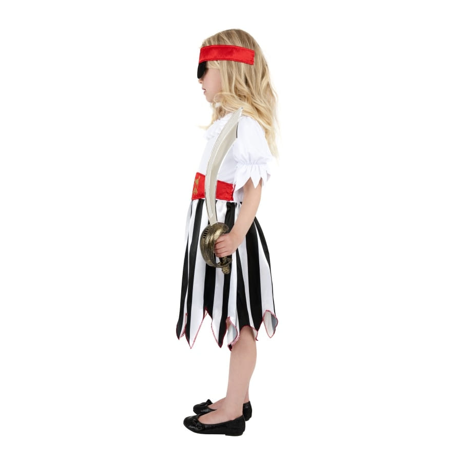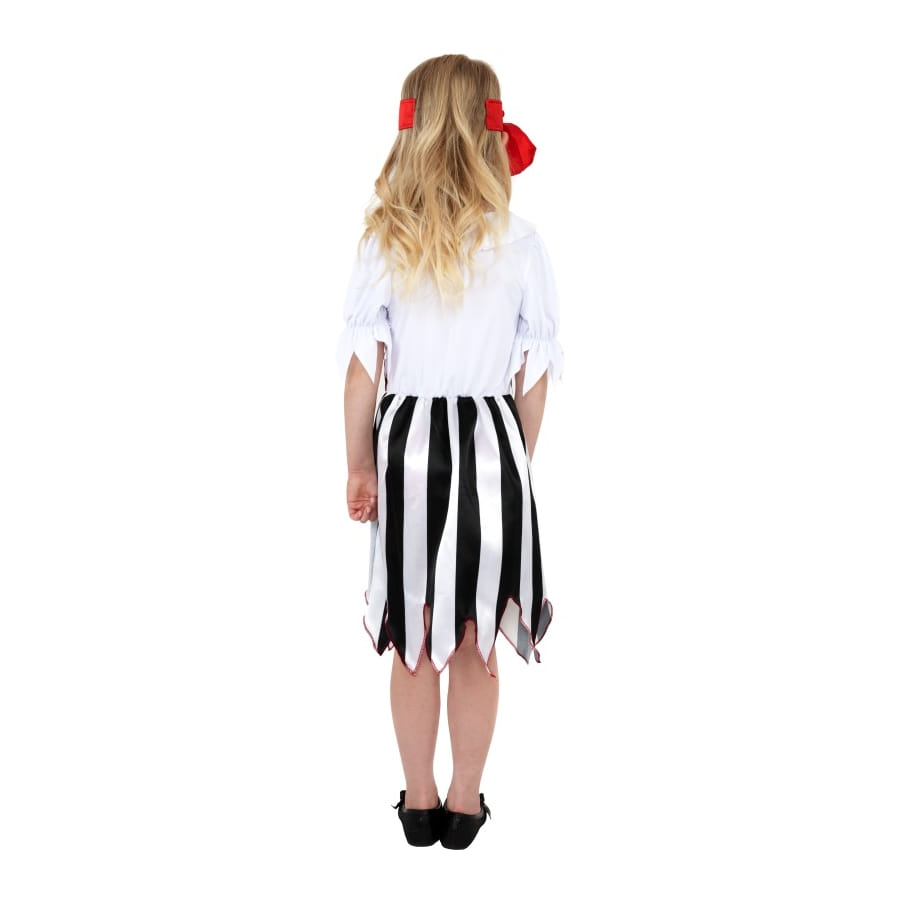Déguisement de pirate composé d'une robe fine avec jupe rayée et ceinture et d'un bandeau. Cet ensemble pour fille est disponible en taille S, M ou L. Déguisez votre fille en pirate pour ses fêtes d'anniversaire.