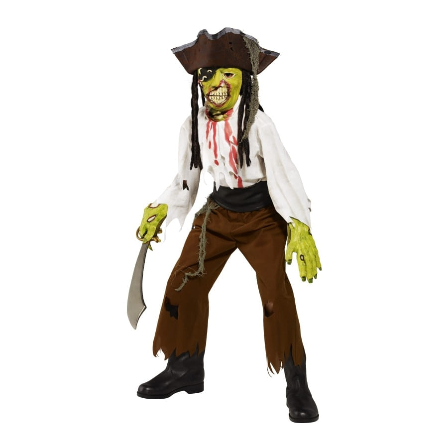 Déguisement de pirate égorgé, pour homme, composé d'un top ensanglanté, d'un pantalon marron, d'une ceinture, d'un masque, de gants verts et d'un chapeau. Le tout est disponible en taille S, M ou L. Le masque vous donnera un aspect effrayant et le sang sur votre cou et votre chemise accentuera ce côté.