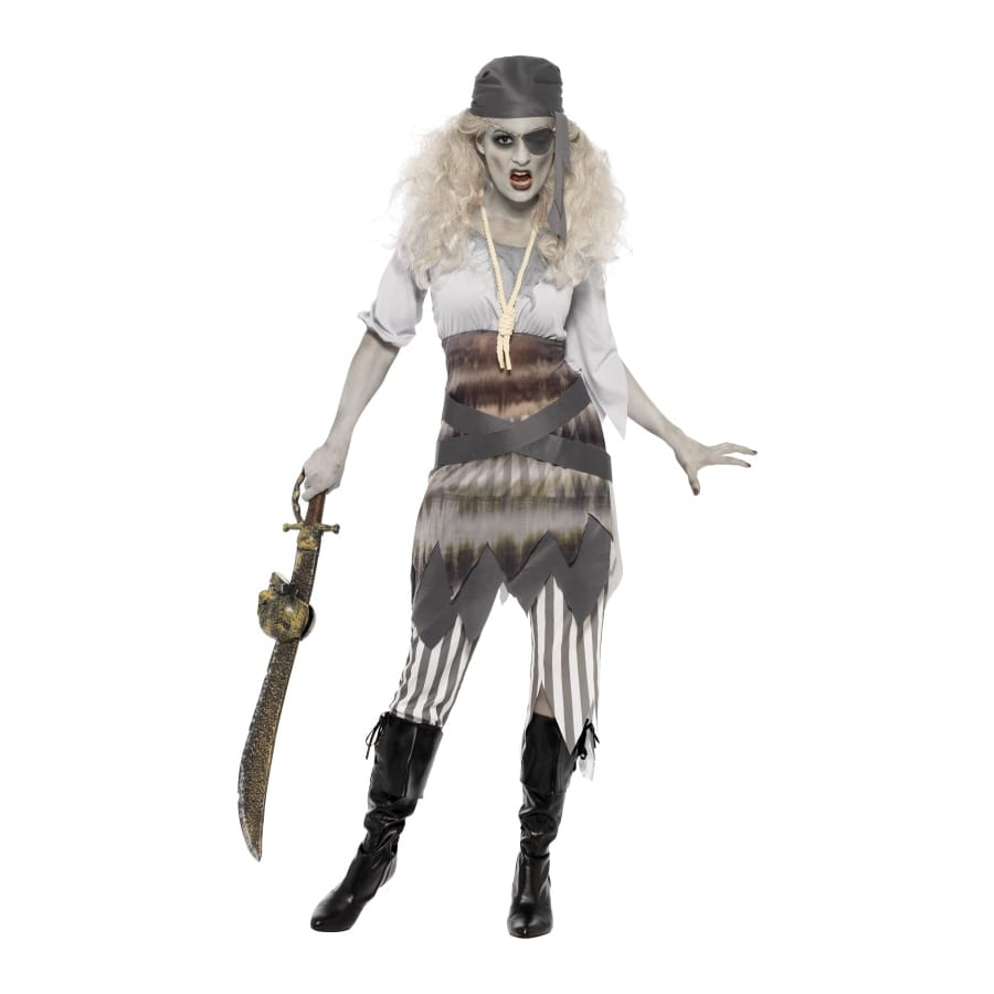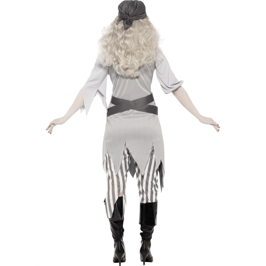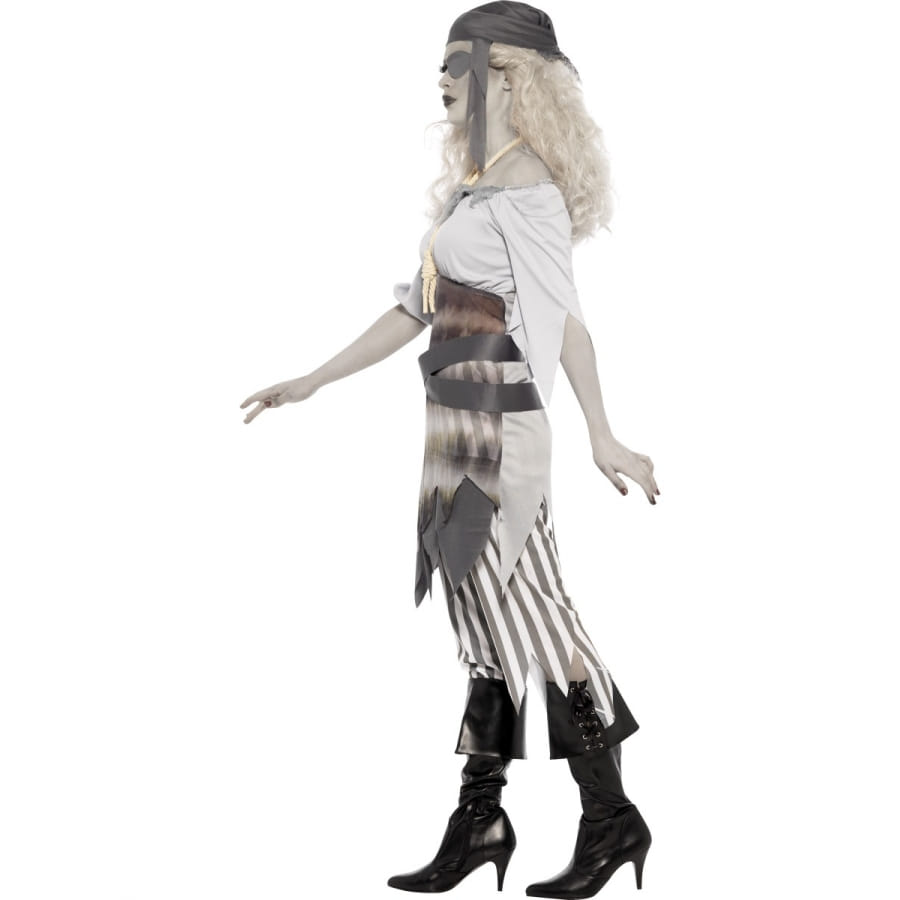 Déguisement de pirate fantôme de couleur blanche et grise, pour femme, composé d'une robe, d'un legging à rayures, d'une ceinture noire, d'un bandana et d'un cache-oeil noir. Ces accessoires sont disponibles en taille S, M ou L. Ils feront de vous un fantôme pirate très convaincant.
