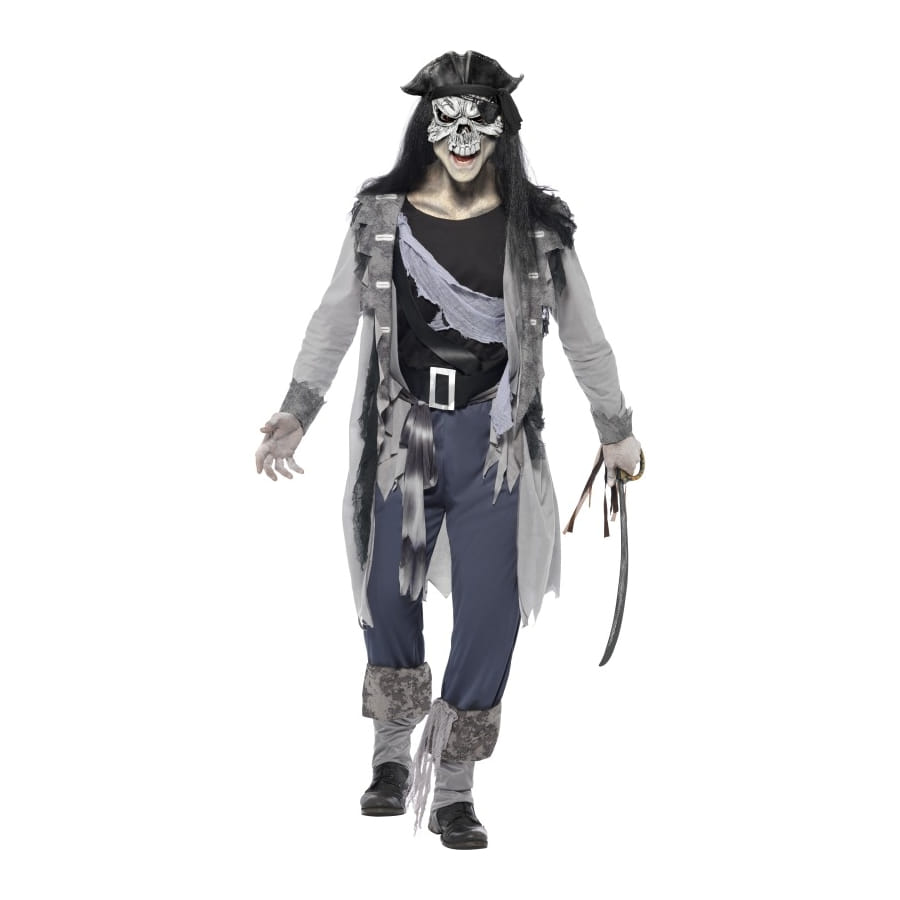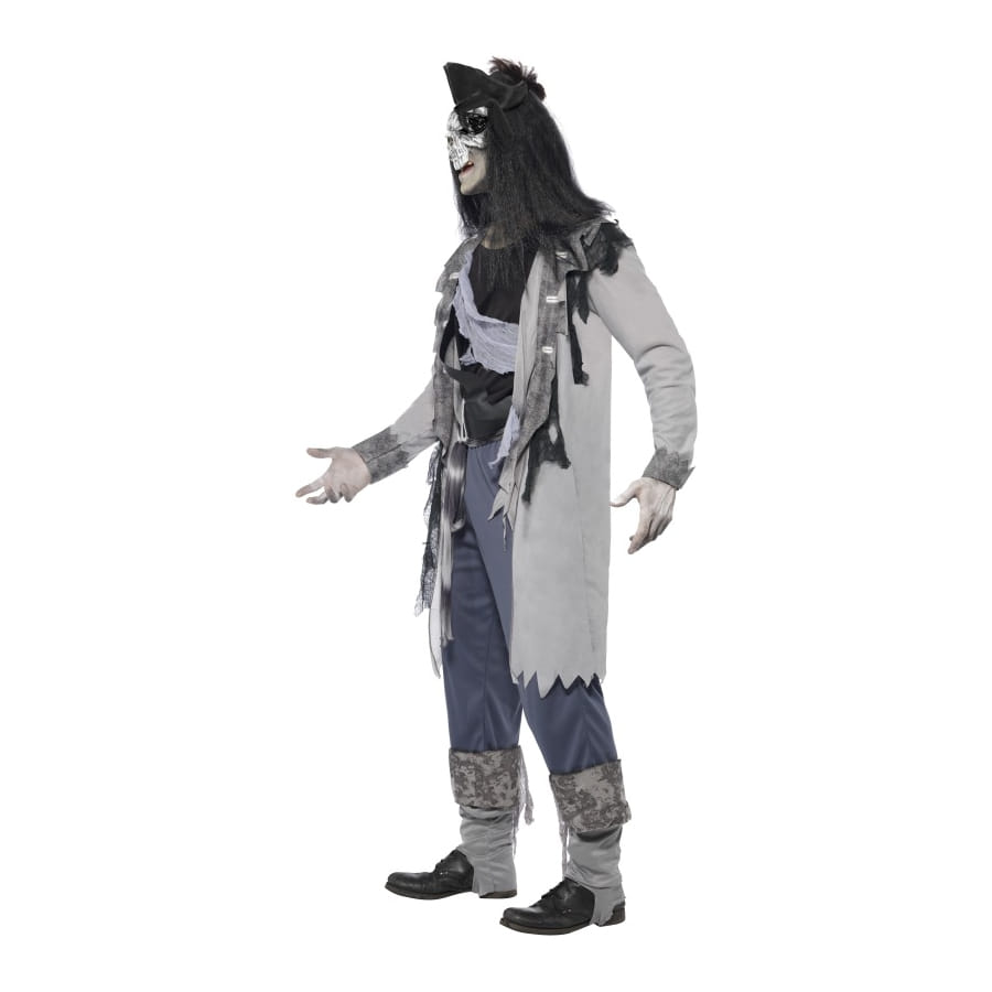 Ce déguisement de pirate hanté, vous ira très bien pour une soirée d'épouvante ou horreur. Vous pourrez porter ce costume de pirate hanté pour halloween. Ce costume est composé d'un manteau de couleur gris, d'un pantalon bleu, d'une ceinture noir et de haut de bottes.