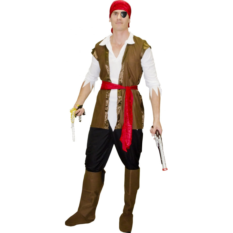 Déguisement de pirate, pour homme, composé d'une chemise attachée, d'un pantacourt noir, d'un bandana rouge et de surbottes marron. Le tout est disponible en taille S, M ou L et est 100% en polyester. Attaquez les bateaux ennemis et volez les trésors avec votre déguisement!