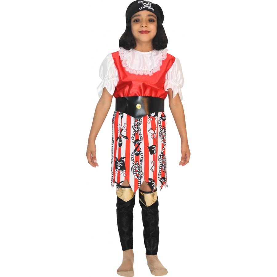 Ce costume de pirate 'Laura' votre fille pourra le porter pour une fête d'anniversaire sur le thème piraterie et corsaire. Ou encore pour le carnaval. Ce magnifique costume est composé d'un foulard noir avec une tête de mort dessus en blanc, d'une tunique blanc, rouge et noir, d'une ceinture noir et d'un pantalon noir et doré.