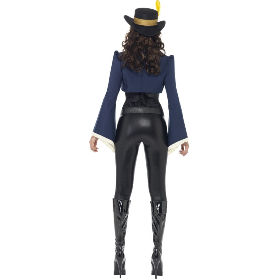 Ce déguisement de pirate penelope vous pourrez le porter pour une fête sur le thème pirate et corsaire. Il est composé d'un top blanc, d'une veste manche longue de couleur bleu, de leggings noir, d'une ceinture noir et d'un chapeau noir avec une plume jaune sur le coté.