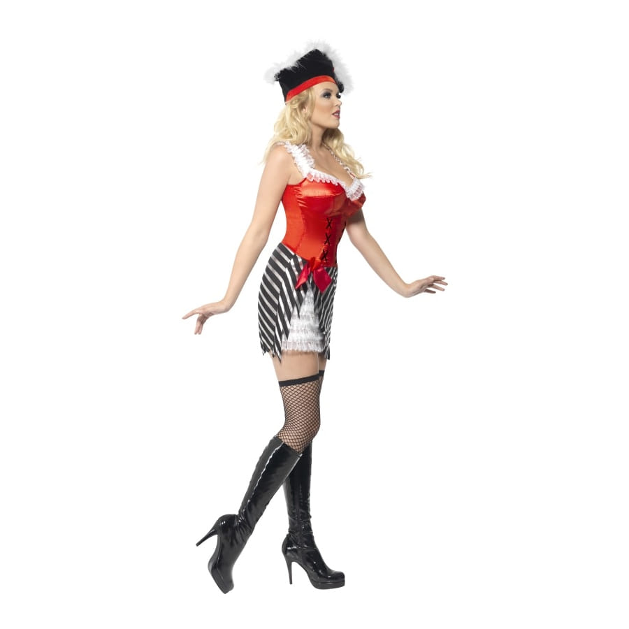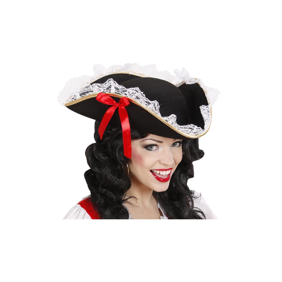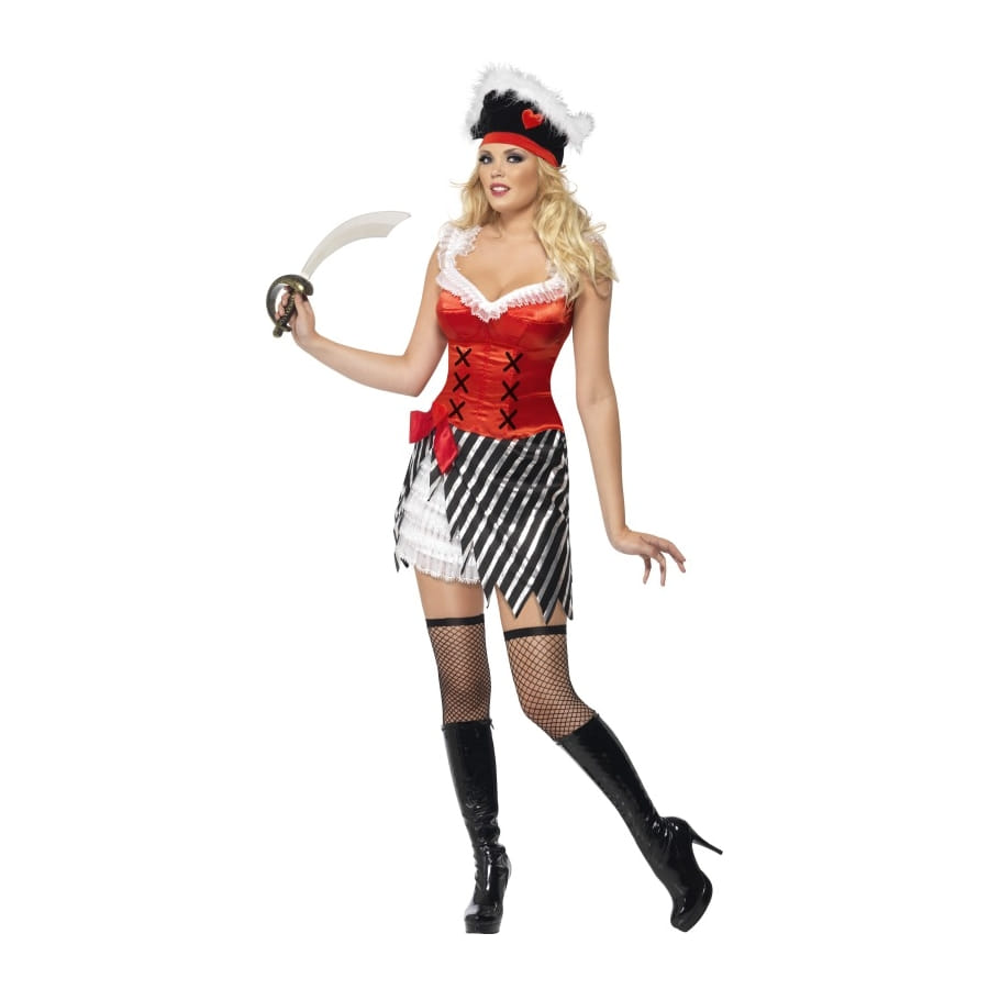 Mesdames dans ce costume de pirate vous serez la plus belle et sexy. Vous pourrez le porter a des occasions comme pirate et corsaire, sexy, charme, action et aventure. Ce costume est composé d'une robe sans manche avec bretelles, de couleur blanc, noir et rouge. Vous aurez aussi un chapeau de couleur noir avec une petite fourrure blanche sur le haut et une bordure rouge sur le bas.