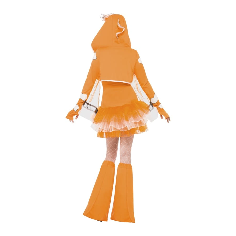 De nos jours, le dress code de nos amis les poissons est en train de connaitre une vraie révolution, à commencer par celui de la dame poisson clown. C’est un style que vous pourrez lui emprunter avec ce déguisement poisson clown pour femme. Il est formé d'une robe orange imprimée de blanc avec une jupette en tutu et des bretelles détachables, d'une veste à capuche en forme de tête de poisson, et des manches en forme de nageoires, et enfin d'une paire de surbottes orange. Vous pouvez le porter tel quel ou avec des collants filets de couleur blanche en dessous. Cet ensemble est disponible en tailles S (36-38), XS (32-34), M (40-42) et L(44-46). Attention les sirènes ! Les poissons clowns risquent de vous choper le titre de Miss Aquatique cette année!