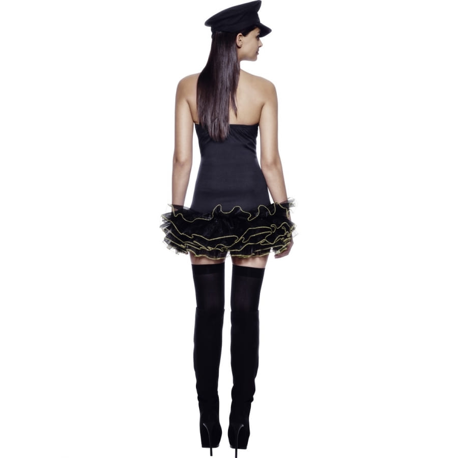 Un costume de policière, cette robe bustier tutu est courte de couleur noire et dorée avec un badge devant. Il est aussi composé d'un chapeau de couleur noire. Ce costume de policière vous pourrez le porter pour une fête comme un enterrement de vie de jeune fille ou encore dans une fête ayant pour thème uniforme.