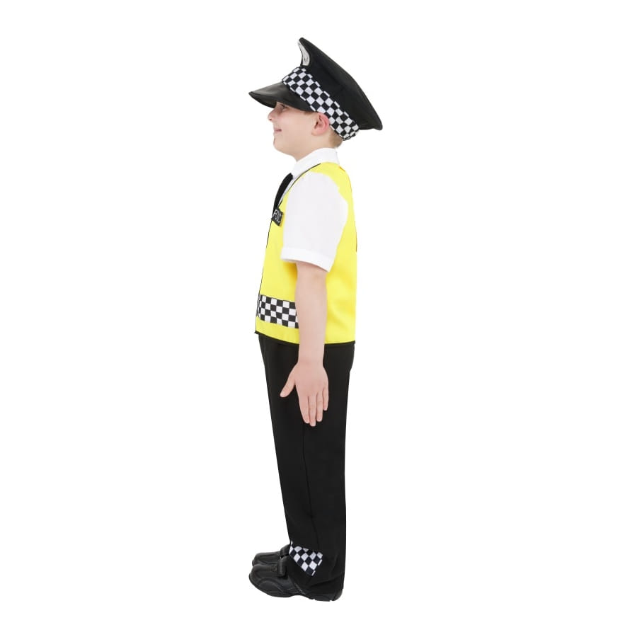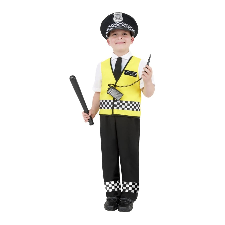 Déguisement de policier, pour enfant, composé d'un pantalon noir, d'une fausse chemise blanche avec gilet jaune et cravate noir, d'un chapeau noir et d'une radio. Le chapeau, le pantalon et le gilet sont imprimés de carreaux noirs et blancs. Le chapeau comporte également une insigne argentée. L'ensemble est disponible en taille S, M ou L. Votre enfant pourra le porter à l'occasion d'une fête reliée aux uniformes.
