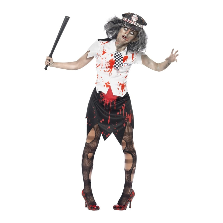 Déguisement de policière zombie, pour femme, composé d'une jupe noire, d'un top blanc avec cravate à carreau et d'une casquette de policier. Le top et la jupe sont ensanglantés. Le déguisement est disponible en taille S, M ou L. Il fera de vous une policière victime d'accident et revenue se venger!