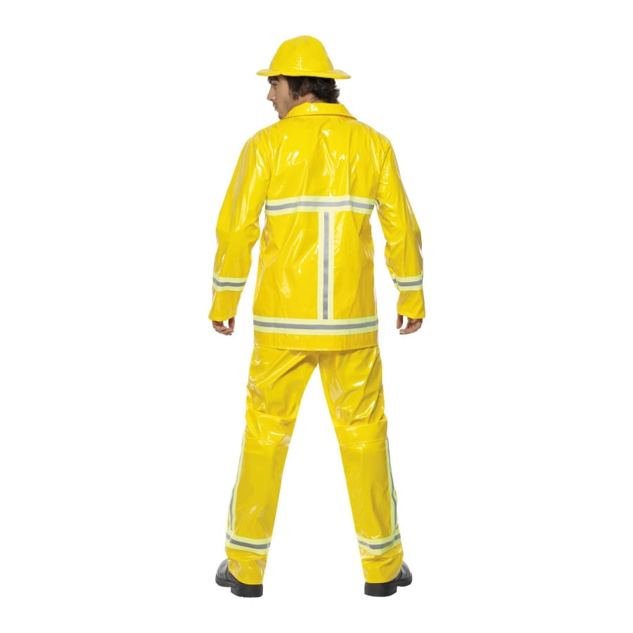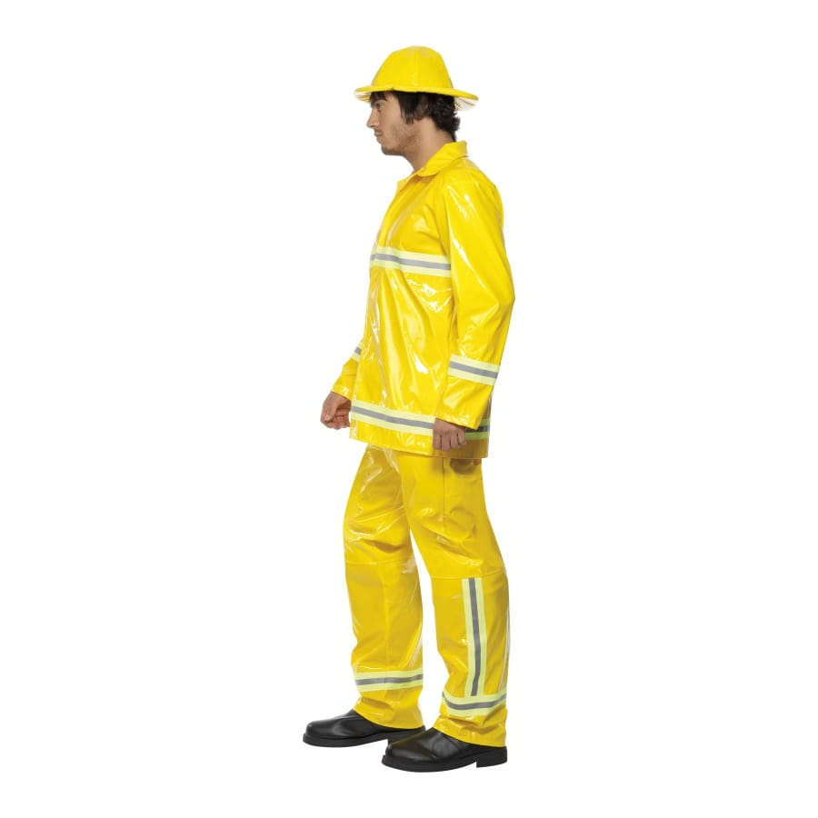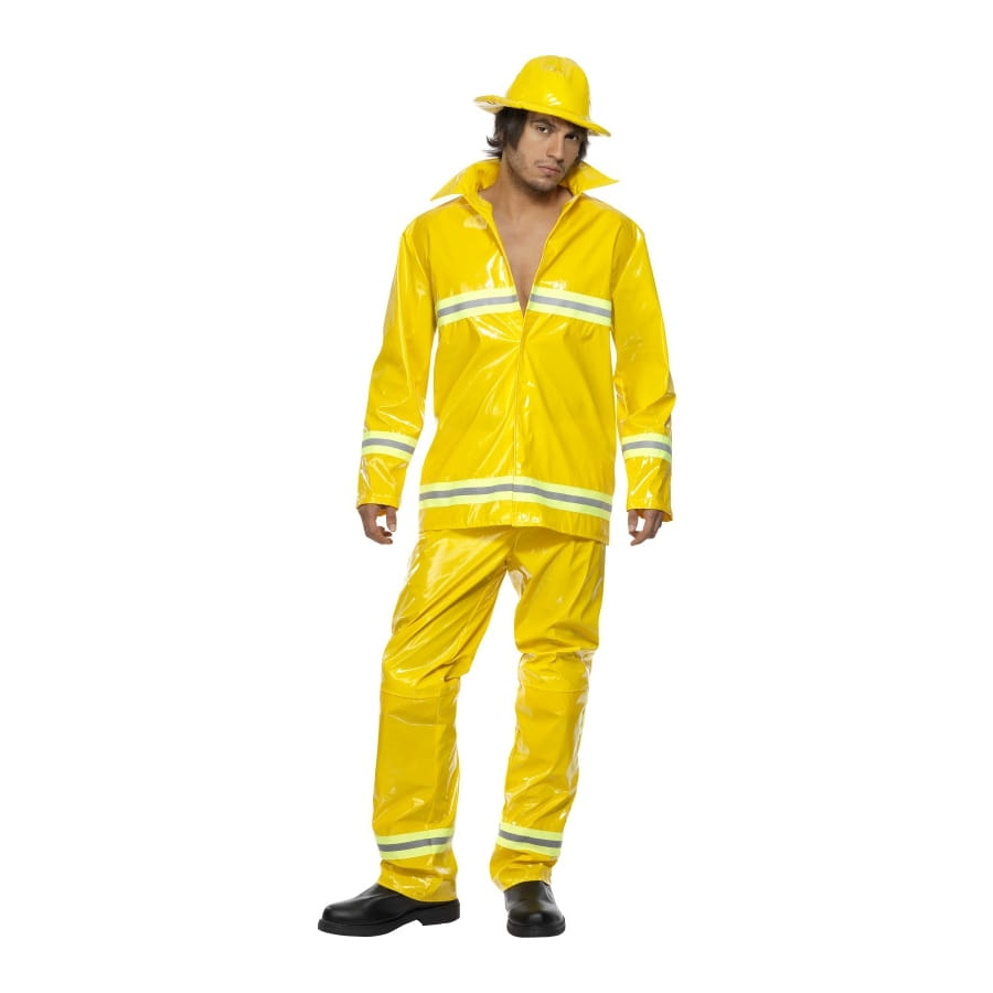 Déguisement de pompier de couleur jaune, pour homme, composé d'une veste, d'un pantalon et d'un chapeau. Le tout est en matière plastifiée avec des bandes blanches ici et là. C'est l'idéal pour une soirée basée sur les métiers.