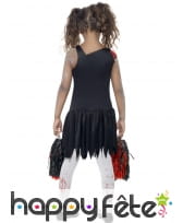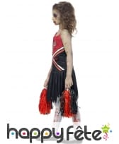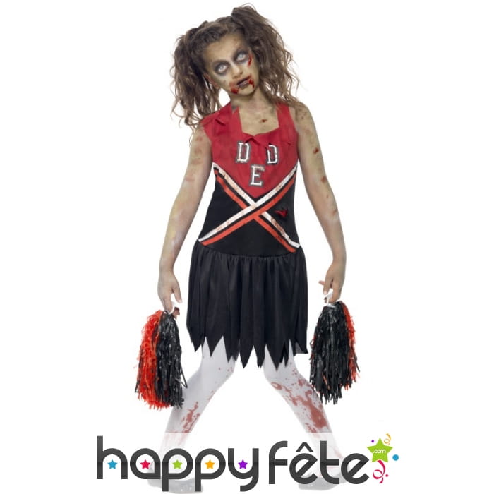 Voici une tenue parfaite pour les petites filles qui adoreraient devenir l'une de ces Pom Poms girls dans les teen movies américains. Le temps d'une nuit,juste en enfilant ce déguisement Pom Pom girl zombie enfant, leur rêve se réalisera, mais d'une façon cauchemardesque! C'est un ensemble formé d'une robe de cheerleader rouge et noire, barbouillée d'une couleur rouge sang, ainsi que d'une paire de pom poms assortis. Elle peut se mettre telle quelle ou bien avec des collants blancs en dessous. L'ensemble est à porter avec des ballerines noires, des cheveux en couettes, et le visage zombifié par la peinture. Cette tenue est disponible en tailles M(7-9 ans) et L(10-12 ans) et T(13/14 ans). Il est conseillé de la nettoyer à sec uniquement.