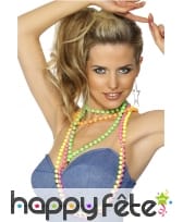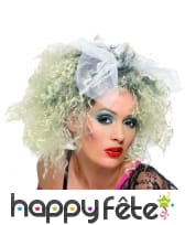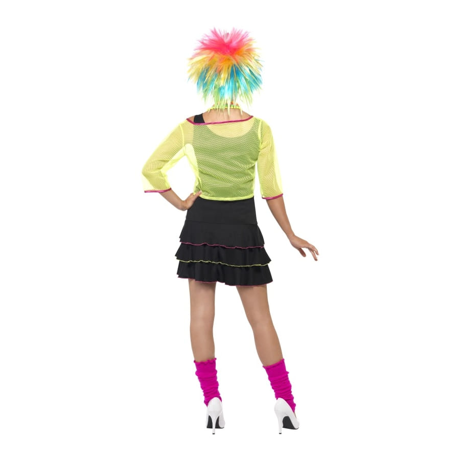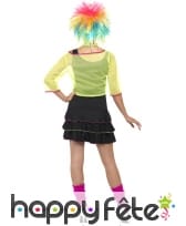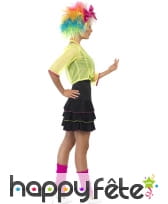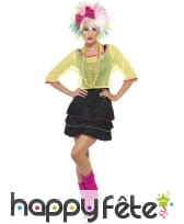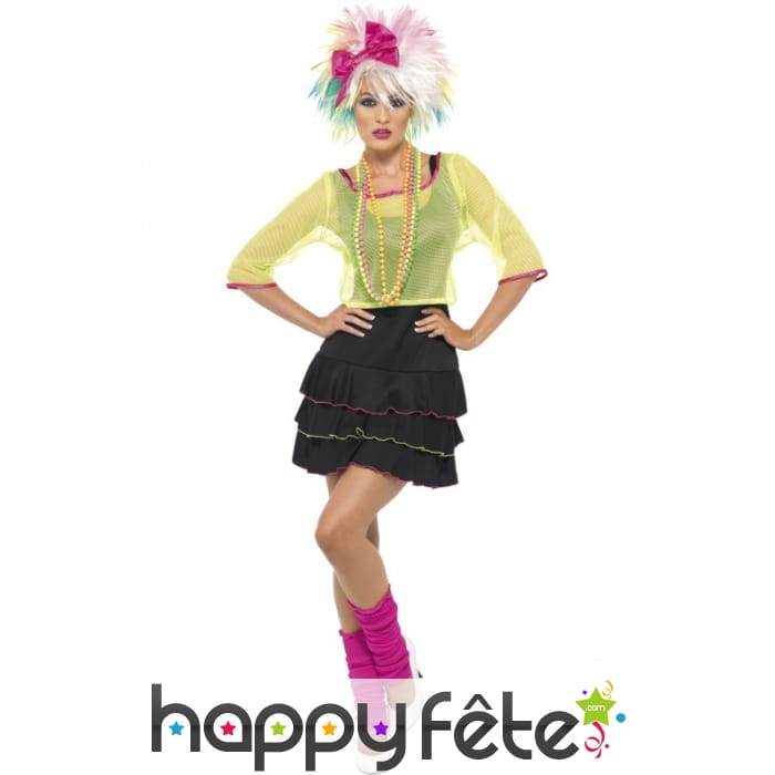 Déguisement de pop star des années 80, pour femme, composé d'un top jaune fluo transparent, d'une robe noire et d'un bandeau en forme d'énorme noeud fuschia. Le tout est disponible en taille S, M ou L. C'est un déguisement flashy et funky qui ne passera pas inaperçu.