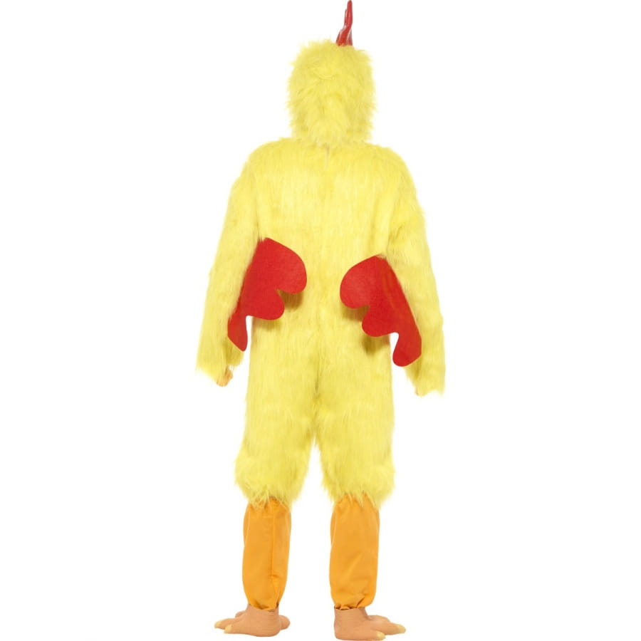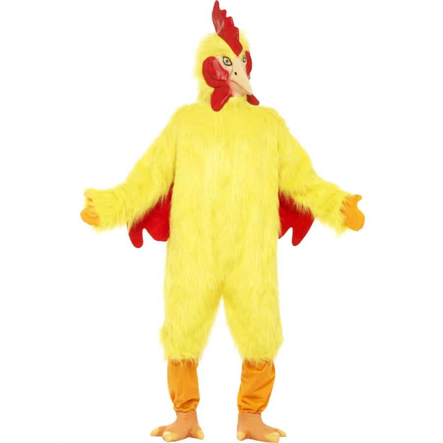 Déguisement de poulet jaune, pour homme ou femme, composé d'une combinaison jaune, d'un masque rouge et jaune et d'une paire de pattes orange. Transformez-vous en animal de ferme pour faire plaisir et amuser les enfants lors d'un anniversaire.