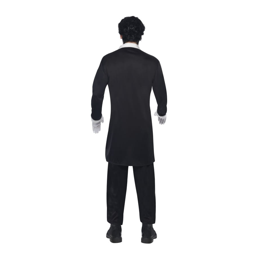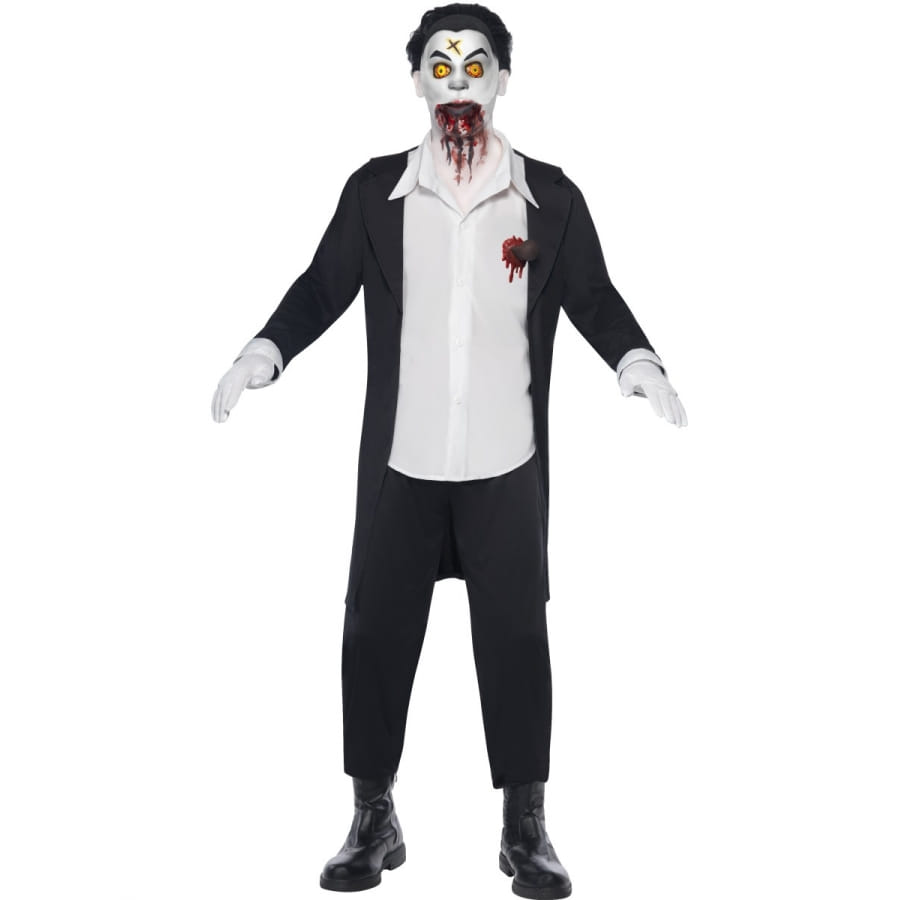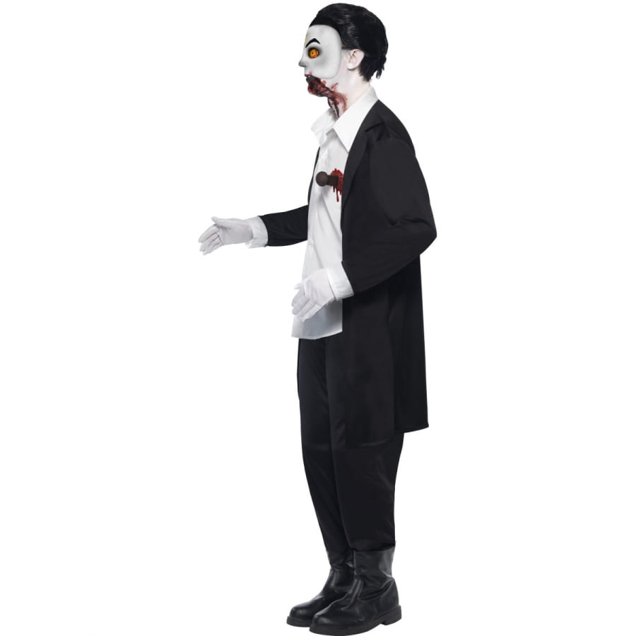 Déguisement de poupée mort-vivante, pour homme, composé d'une veste noire avec fausse chemise blanche et d'une masque blanc avec cheveux noirs. Cet ensemble vous transformera en marionnette zombie terrifiante.