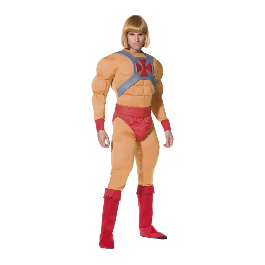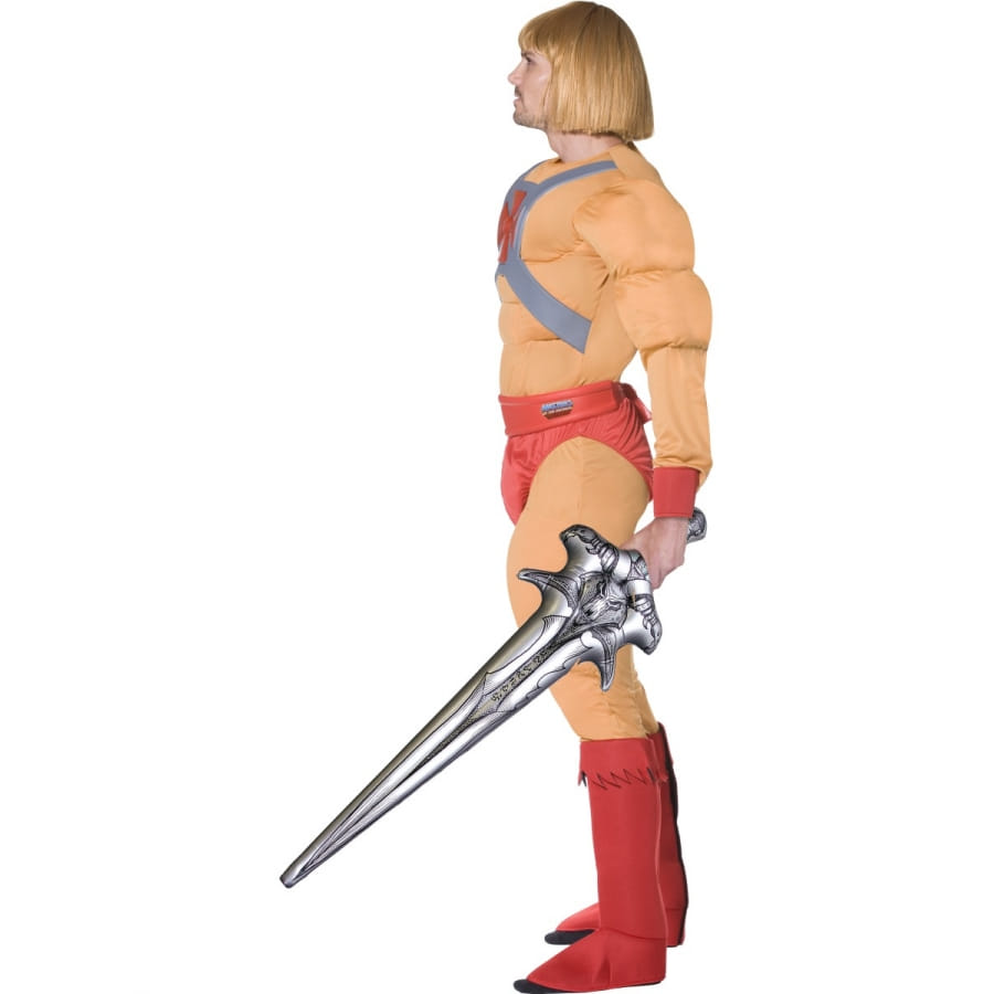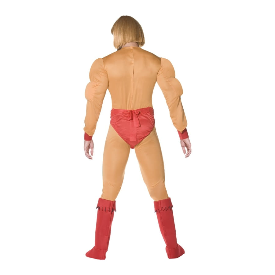 Déguisement de Prince Adam d couleur rouge et bleue, composé d'une combinaison rembourrée avec ceinture, de manchettes, de couvre-bottes et d'une épée gonflable. Cet ensemble est disponible en taille S, M ou L. Il sera parfait pour vous donner une apparence plus forte pour une fête basée sur le thème des héros ou des guerriers.