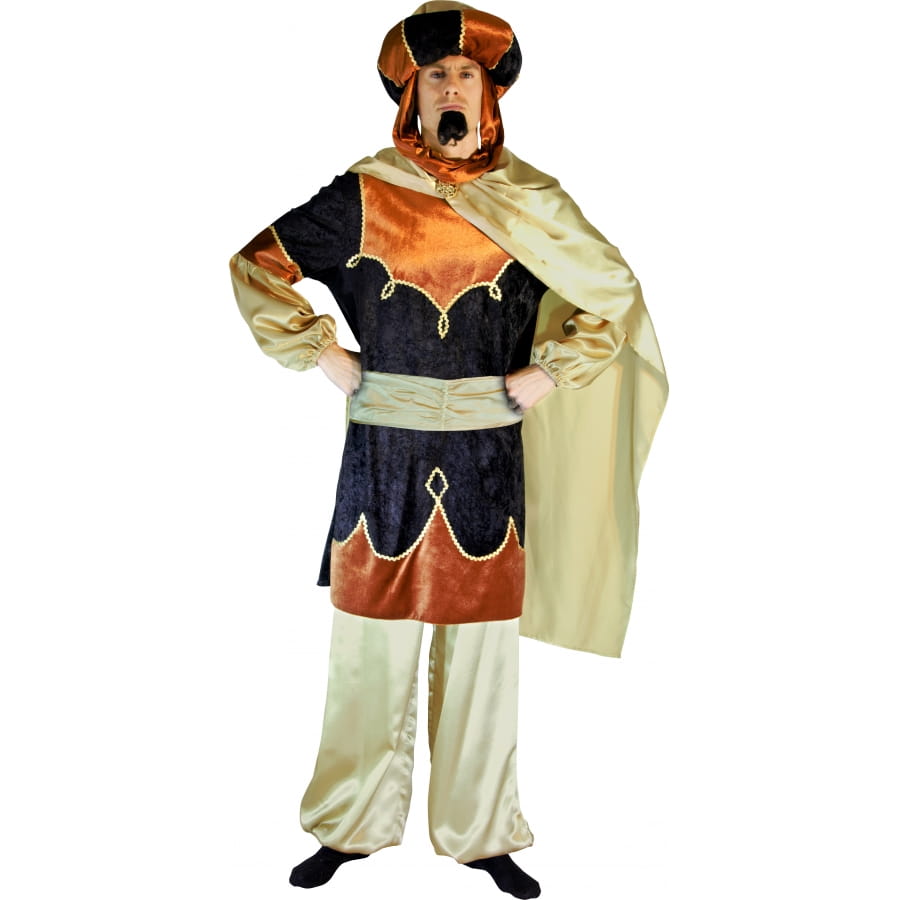 Pour une soirée orientale rien de mieux que de se déguiser en prince orientale. Vous serez le prince des 1001 nuit dans ce déguisement de taille 50, 52. Il est composé d'un pantalon beige, d'une tunique noir et orange, d'une grosse ceinture beige, d'une cape beige avec fermoir et d'une coiffe rouge et noire.