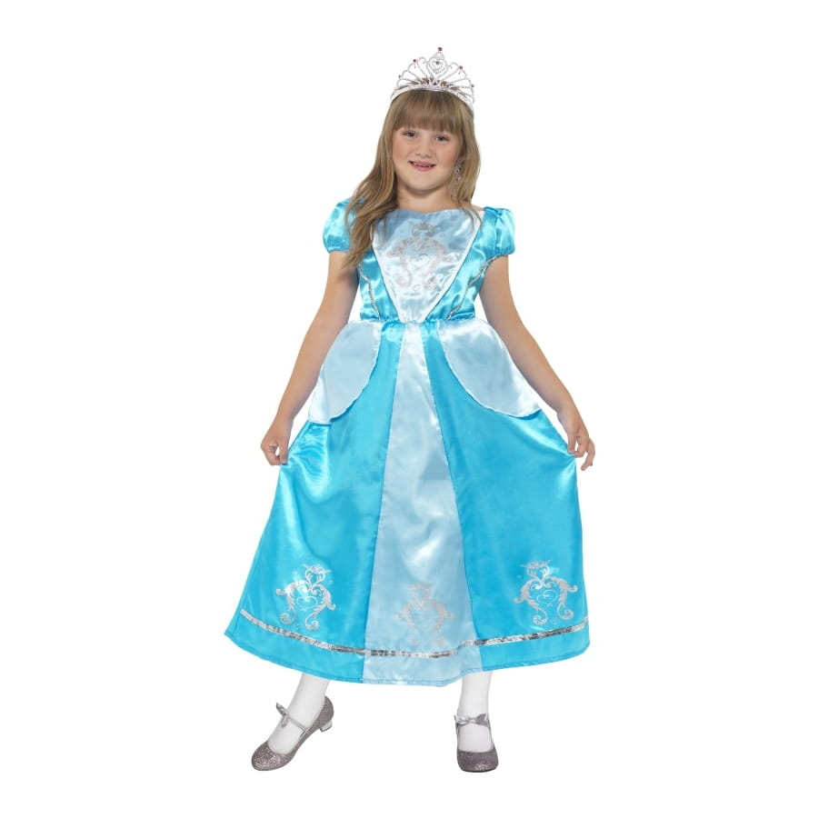 Vous avez un ange de petite fille, qui travaille bien à l'école, qui vous aide à la maison, et qui s'occupe bien de ses frères et soeurs? Pour la récompenser, montrez-lui qu'elle est une vraie princesse, en lui offrant ce déguisement de princesse bleue. Cette tenue est composée d'une robe de princesse bleue claire, avec une partie blanche au niveau de la poitrine, au niveau des hanches et au milieu de la robe, ornée de petites décorations argentées. Une petite tiare avec cette robe serait parfaite pour bien faire briller ses petits yeux. Les tailles proposées sont S(4 à 6 ans) et M(7 à 9 ans). Attention, cette tenue est déconseillée pour les petites filles de moins de 3 ans à cause des petites pièces qui la constituent. A garder loin du feu. Les colorants utilisés peuvent se déteindre. Nettoyer à sec!