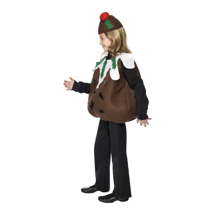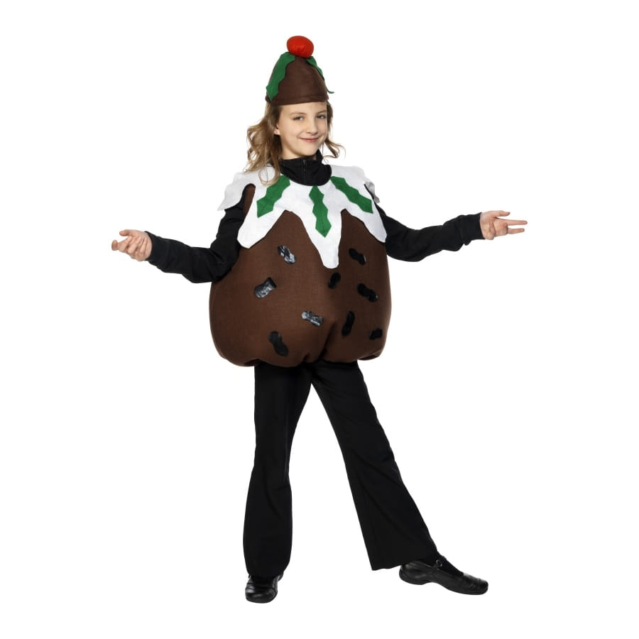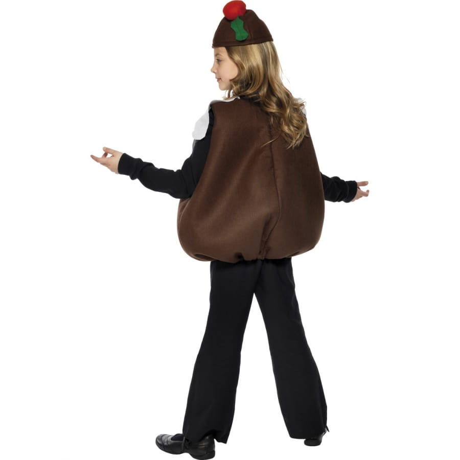 Déguisement de pudding de Noël, pour enfant, composé d'une combinaison en forme de pudding de couleur marron, blanche, verte et noire ainsi que d'un chapeau assorti avec cerise rouge. Ce déguisement amusant fera de votre enfant un vrai délice lors des fêtes de fin d'année!